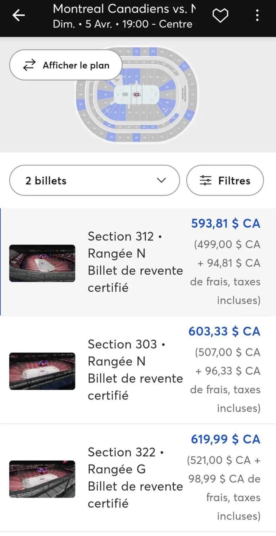 Troisièmes rangée derrière le banc du Canadien…$34 / billet !!!