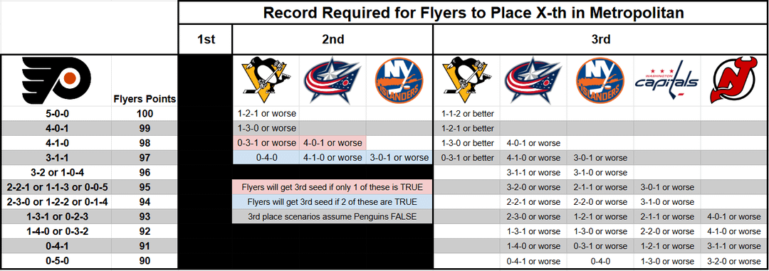 Tableau approximatif que j’ai dressé décrivant les résultats possibles des 5 derniers matchs des Flyers, puis les records que les autres équipes de la division auraient besoin pour que nous obtenions la 2e ou la 3e tête de série. Je n’ai pas inclus de scénarios joker car les choses deviennent complètement compliquées avec environ 10 équipes impliquées.