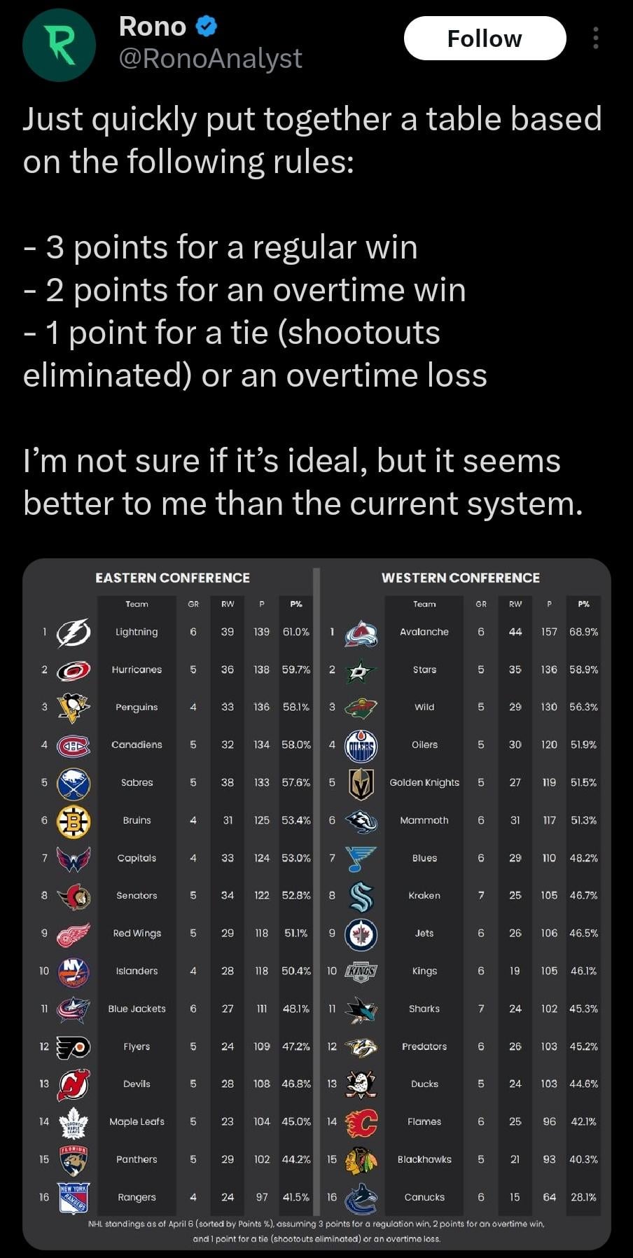 It’s interesting that the PWHL uses the 3-2-1 system but the NHL doesn’t; even if it likely wouldn’t shake up the standings *that* much, I much prefer an incentive that gets teams to play more for the win during regulation.