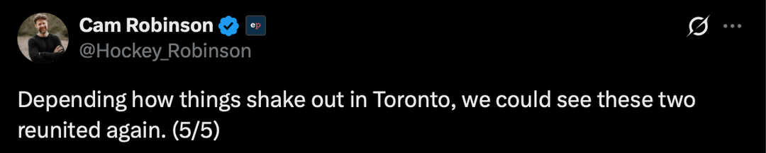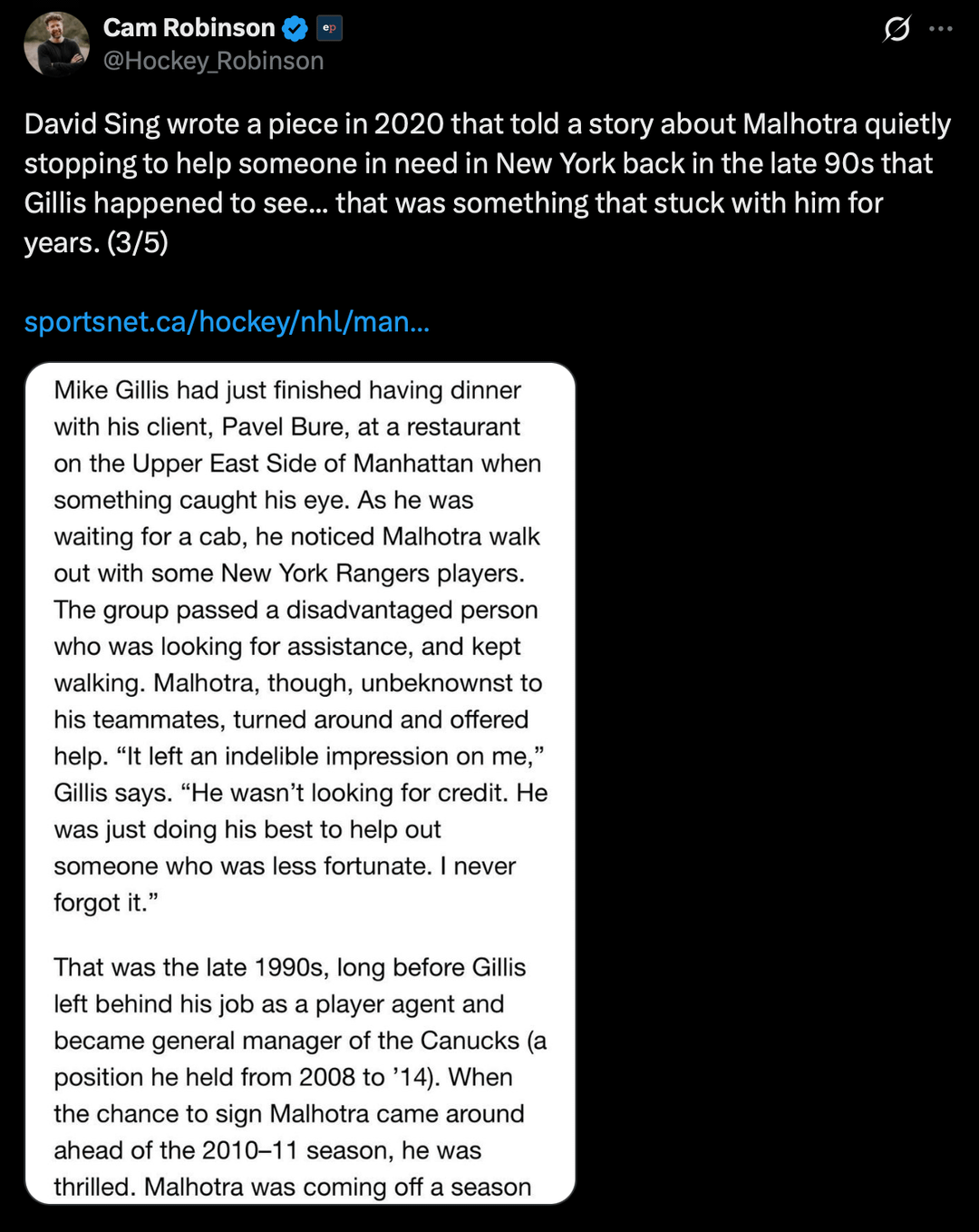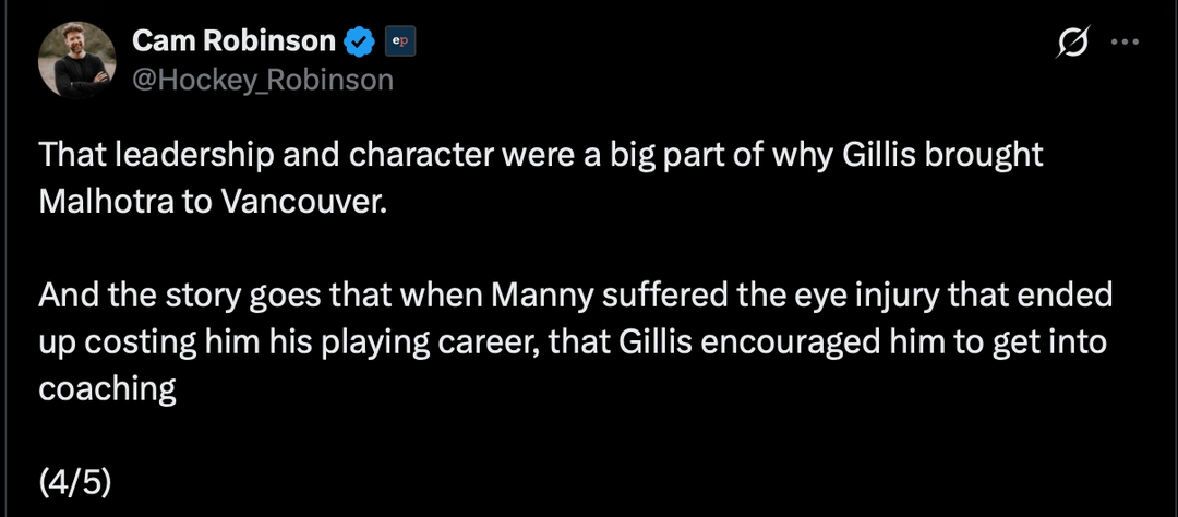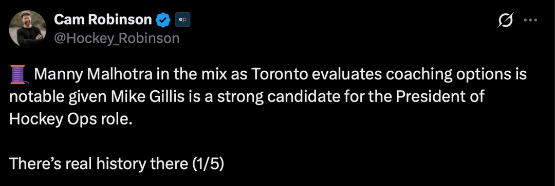 [Cam Robinson] Manny Malhotra dans le mix alors que Toronto évalue les options d’entraîneur est remarquable étant donné que Mike Gillis est un candidat sérieux pour le rôle de président des opérations hockey. Il y a là une véritable histoire.