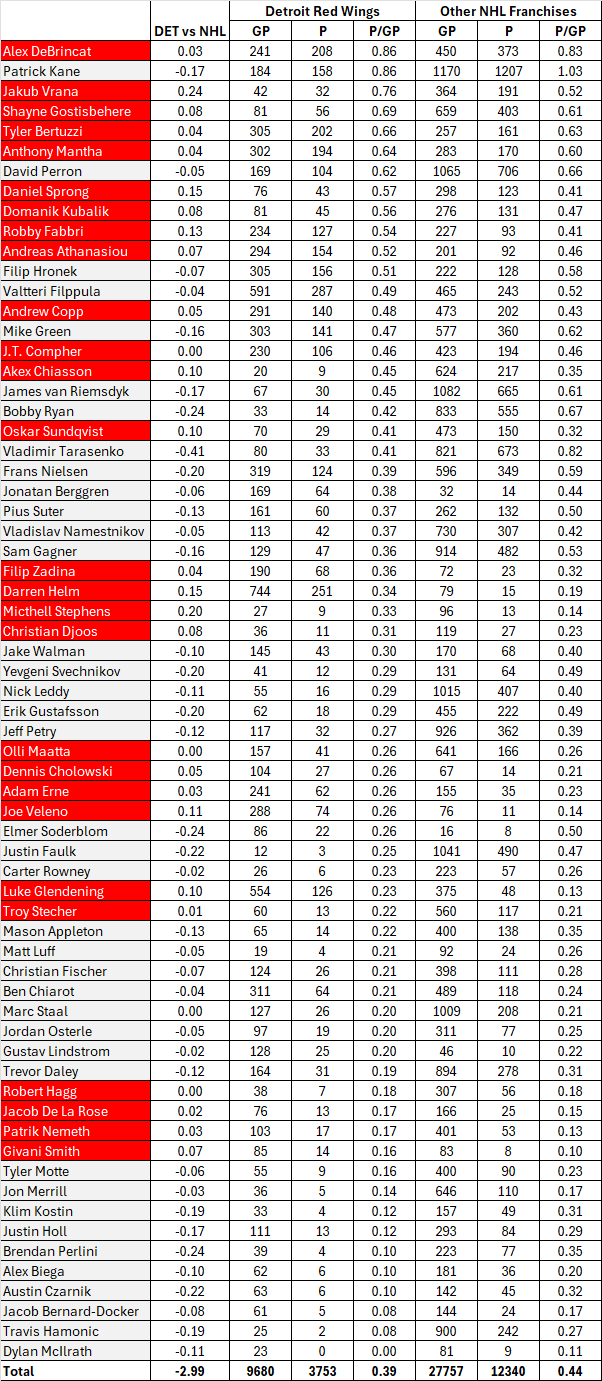 It’s interesting to look at, but this has no useful value in terms of analysis. Age is a factor, for example. Nobody should expect JVR or Kane to score at the same level with the Wings as they did previously in their careers. There are several additional issues with this kind of raw data.