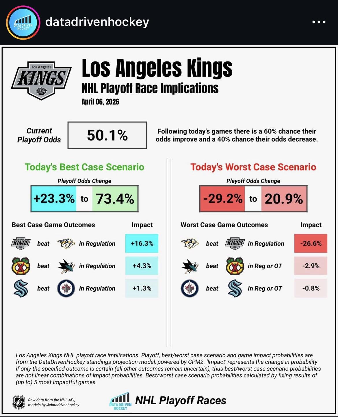 How this game goes will show if we are going to make it into the playoffs and what we can expect from the kings if they do make it in. Sure there’s the number game of percentage and shit but anything can happen and I don’t like to rely on the numbers. This is a must win for how we finish the season and how we approach the playoffs. If we kill it tonight I actually am delusional enough to say we take the first series no matter who it is we play. Once you get into the playoffs its a different beast.