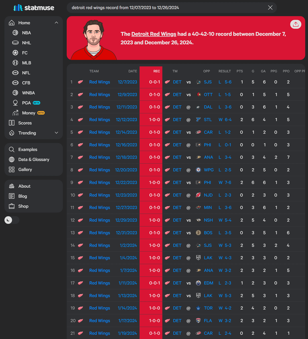 Cependant, après ces conneries "perdons la partie" pénalité, j’étais curieux de savoir quel est son réel +\-. Sur sa carrière c’est un +1. Au cours de son temps avec les ailes, il fait -20. Cela n’inclut pas les pénalités qu’il a prises et qui ont conduit à un but.