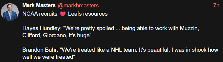 La NCAA recrute ❤️ Ressources des Leafs. Hayes Hundley : « On est plutôt gâtés… pouvoir travailler avec Muzzin, Clifford, Giordano, c’est énorme ». Brandon Buhr : « Nous sommes traités comme une équipe de la LNH. C’est magnifique. J’ai été choqué de voir à quel point nous avons été traités »