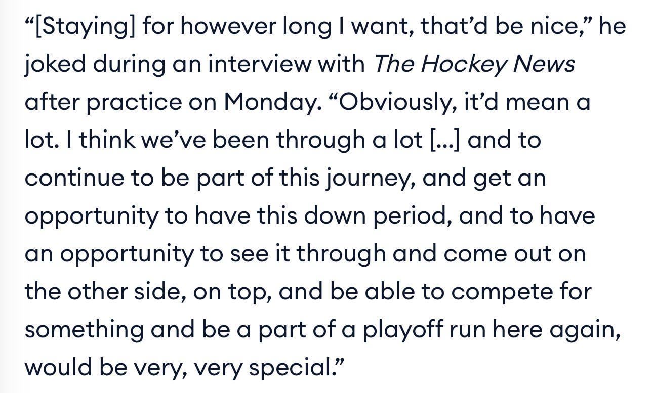 He won a cup, he doesnt have to chase one, he knows if he stays there is extra money for playing on a rebuilding team, the front office are familiar to him. Its really not a shock and its a nobrainer he wants to stay.