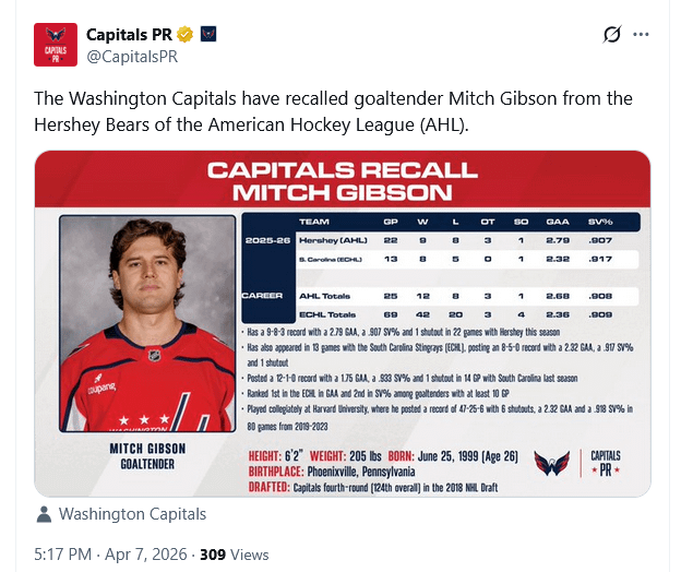 Les Capitals de Washington ont rappelé le gardien Mitch Gibson des Hershey Bears de la Ligue américaine de hockey (AHL).