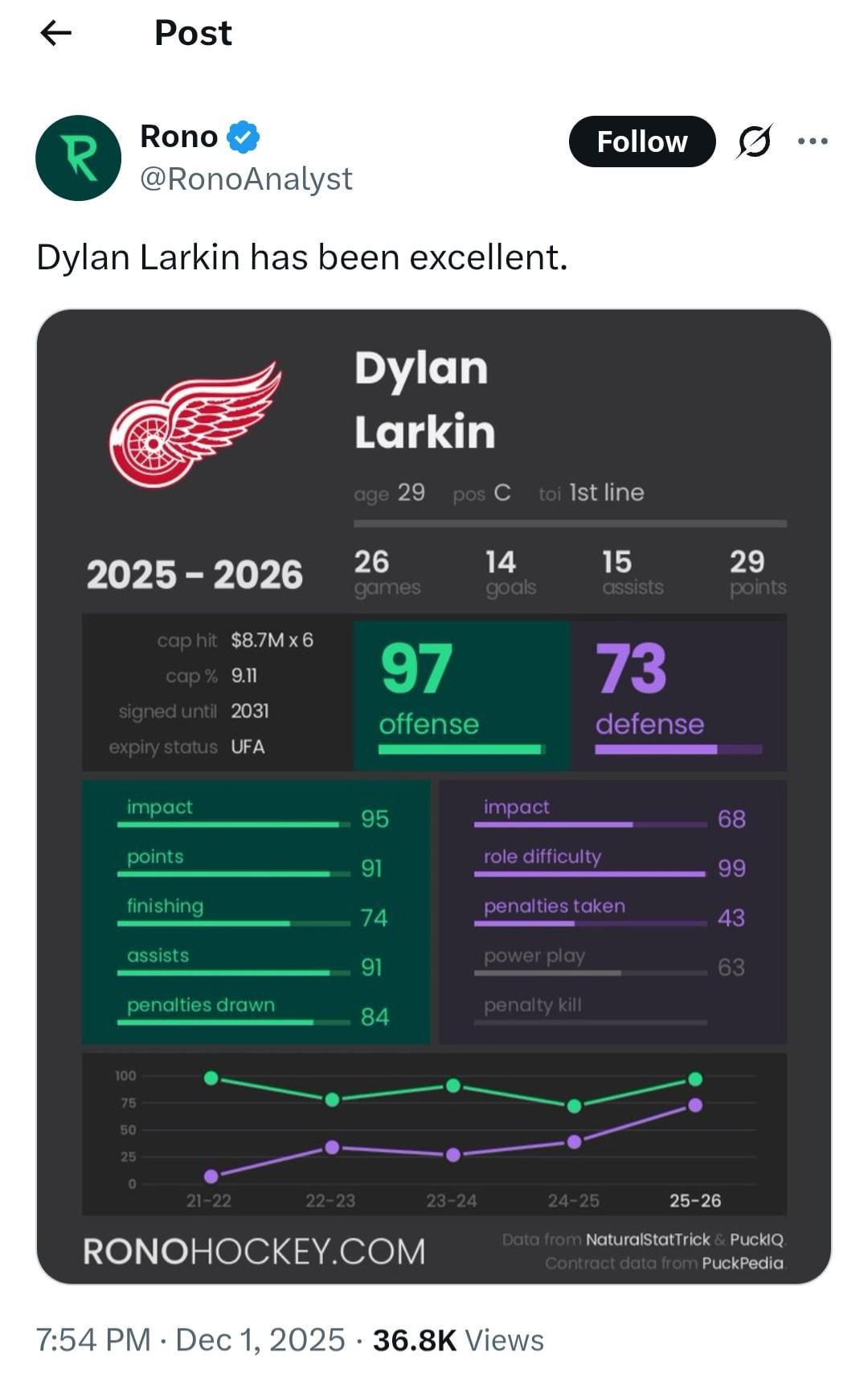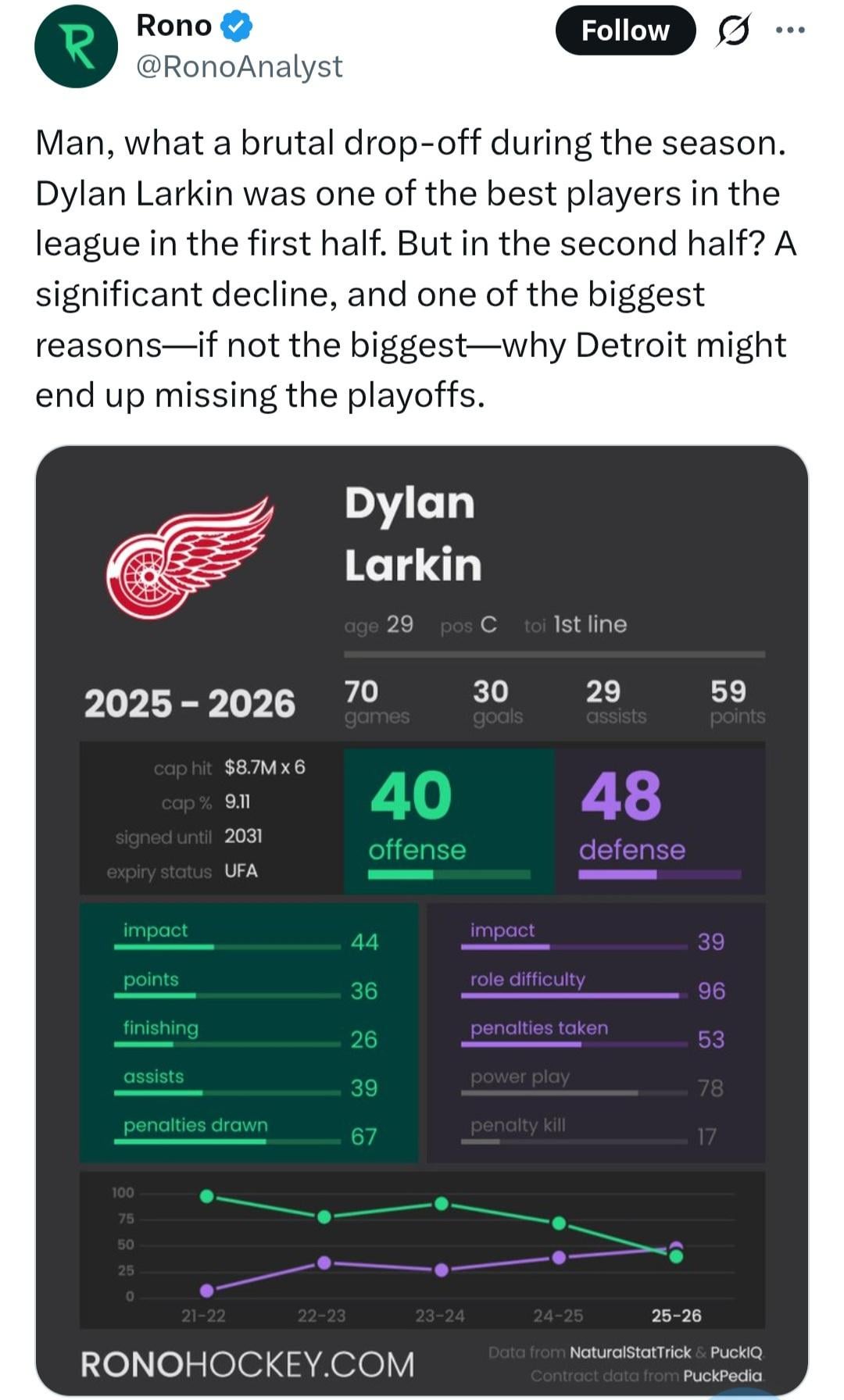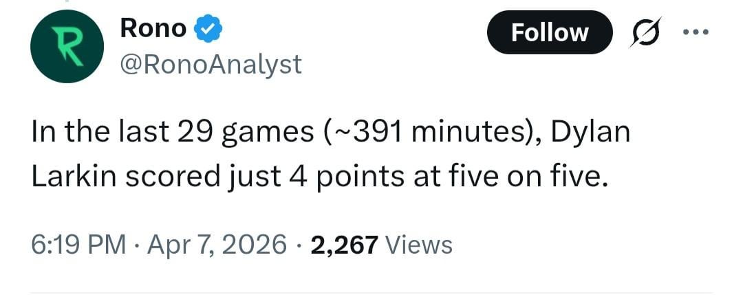 I don’t get it with the Larkin hate. He’s not McDavid but my god is a a competent middle of the league 1C everyday for the last several years.