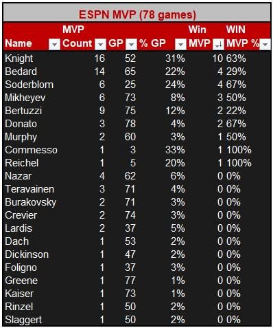J’étais curieux de connaître les performances en termes de victoires et de défaites, j’ai donc rassemblé quelques statistiques MVP en termes de victoires par rapport au nombre global de MVP. J’ai utilisé les ESPN Top Performers du programme ESPN (d’accord, je ne viens pas des États-Unis et je ne sais pas si c’est la meilleure façon de procéder, alors excuses d’avance).