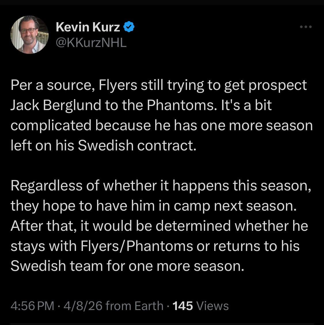 [Kurz] Selon une source, les Flyers essaient toujours de faire rejoindre le prospect Jack Berglund aux Phantoms. C’est un peu compliqué car il lui reste encore une saison sur son contrat suédois.