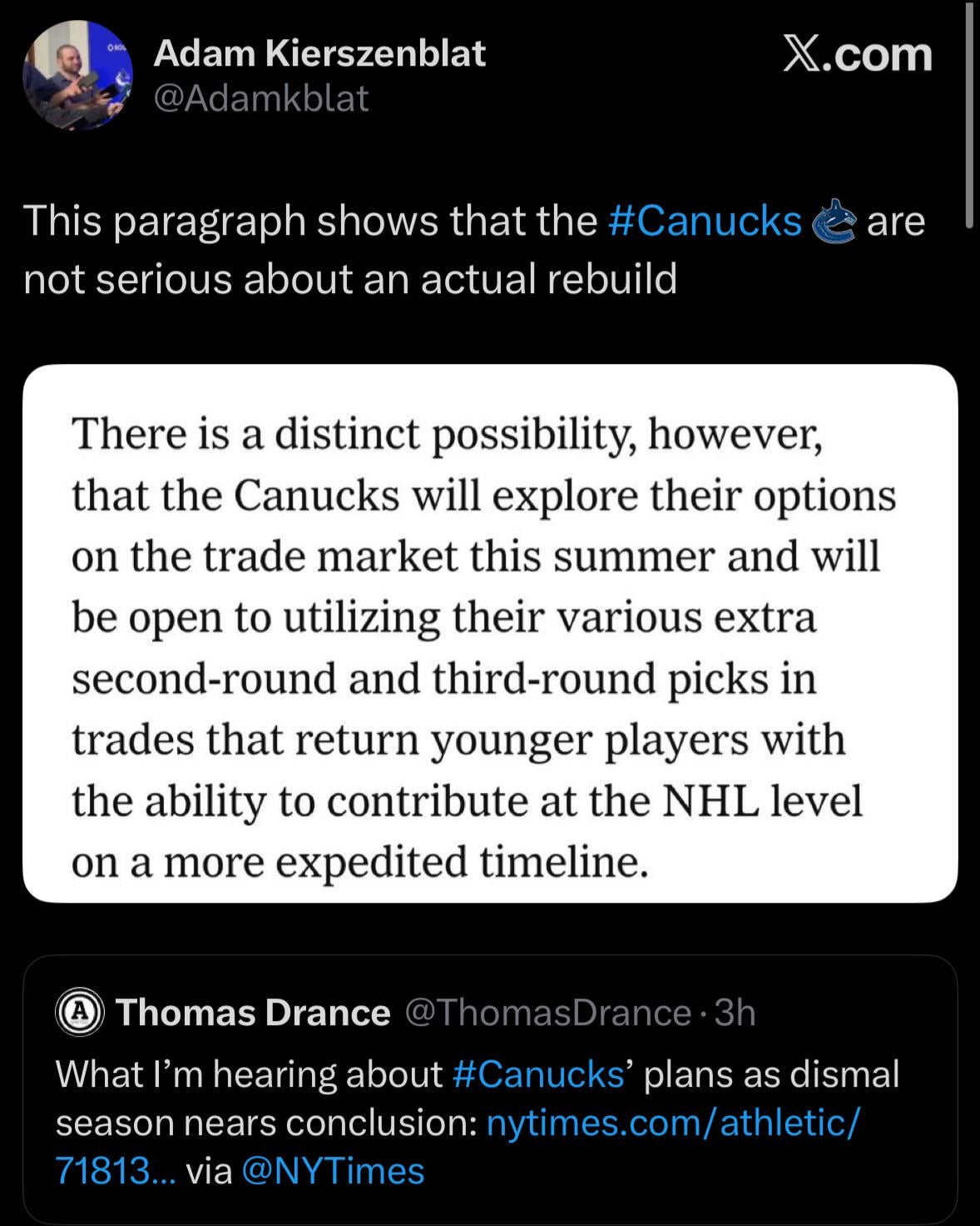 [Drance/Kierszenblat] « Les Canucks exploreront leurs options sur le marché commercial pour leurs choix de deuxième et troisième ronde pour les jeunes joueurs de la LNH. »