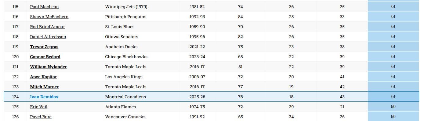 Demidov avec 61 points devance Pavel Bure et égalise Bedard, Marner et Alphredsson dans une saison de recrue.