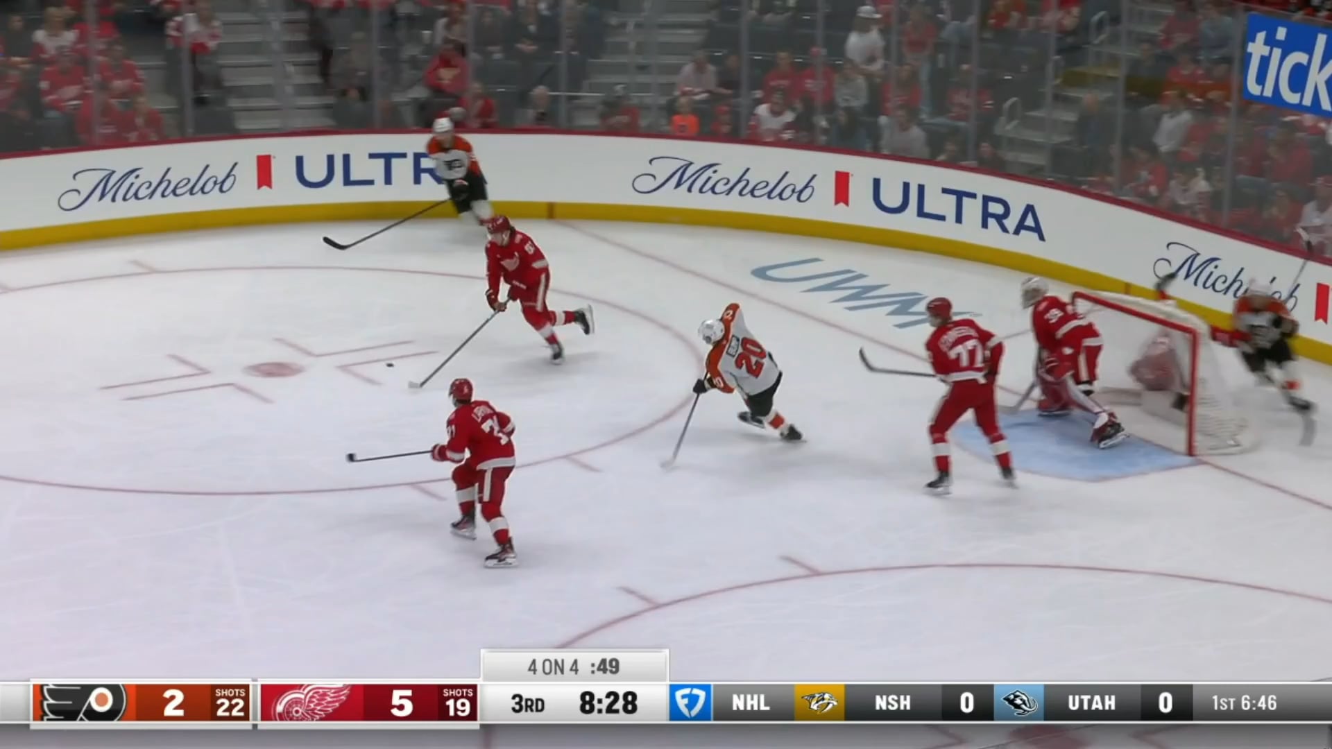 [DET (6) – PHI 2] Larkin en tire un pour le tour du chapeau lors d’une course à 2 contre 1 avec Seider. C’est le 4ème point de la soirée pour Larkin et le 5ème point de la soirée pour Seider.