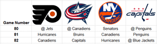 Im convinced the way it will play out is all 4 of these teams go 1-2 in their final 3 and Flyers make it.