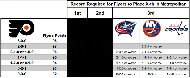 Six points (3-0-0) definitely guarantees 3rd place. But 4 points (2-1-0 or 1-0-2) probably does, too. If we get 4 points, the NYI would be eliminated with one regulation loss to Ottawa, Montreal, or Carolina — which is definitely happening. And Columbus would have to beat all 3 of Montreal, Boston, and Washington — which is definitely not happening.