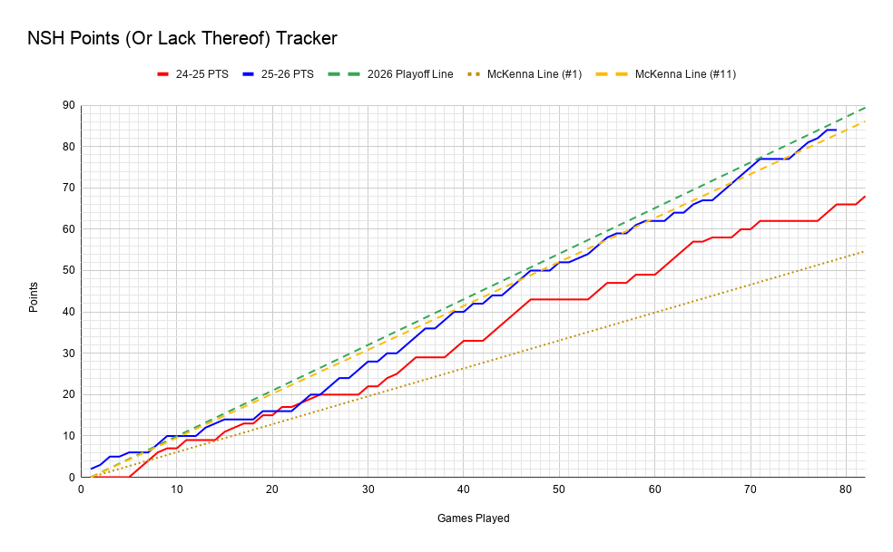 They were probably going to drop a game to either the Wild or the Mammoth realistically. If they can beat the Wild and win out, there’s a possibility the Flames or Kraken play a season spoiler. I’m doubtful, but the Preds seem to turn it on when hope is lost.