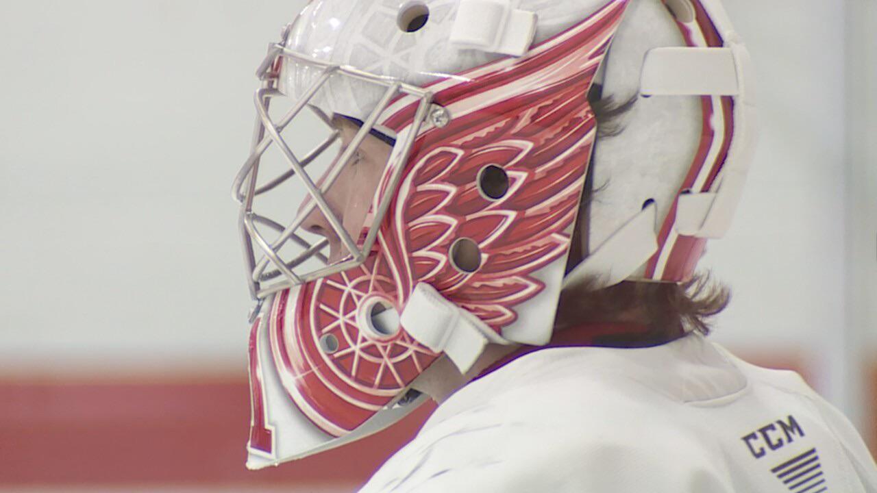 Trey Augustine porte son nouveau masque lors du dernier entraînement GR