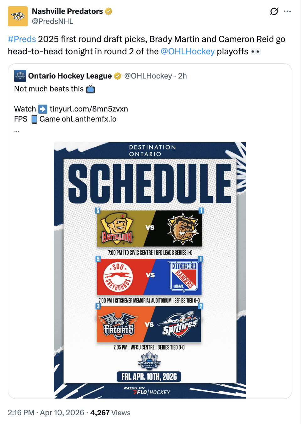 [Nashville Predators] Les choix de première ronde des Preds 2025, Brady Martin et Cameron Reid s’affrontent ce soir au deuxième tour des séries éliminatoires de la OHL