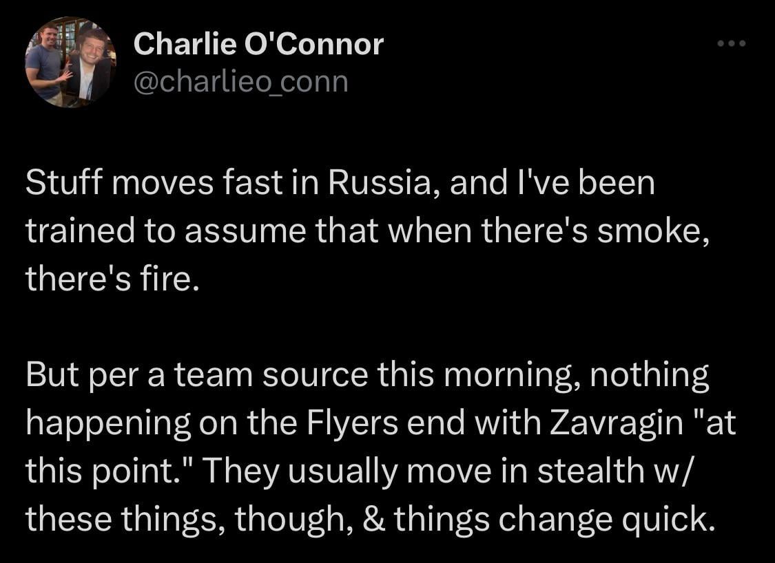 [O’Connor] Les choses bougent vite en Russie, et j’ai été entraîné à supposer que lorsqu’il y a de la fumée, il y a du feu. Mais selon une source de l’équipe ce matin, rien ne se passe du côté des Flyers avec Zavragin « à ce stade ». Cependant, ils se déplacent généralement furtivement avec ces choses, et les choses changent rapidement.