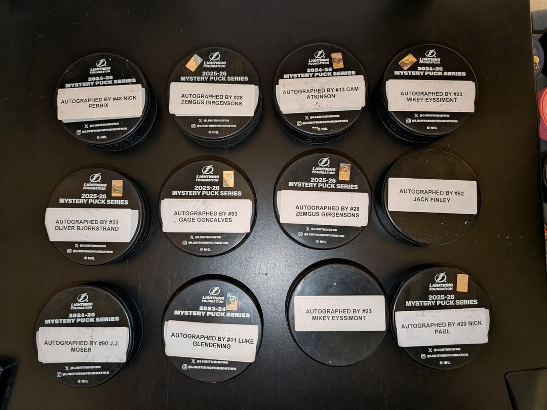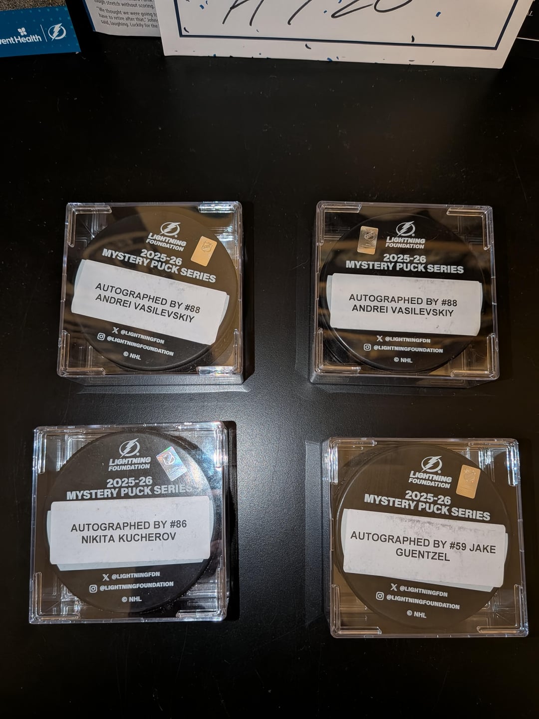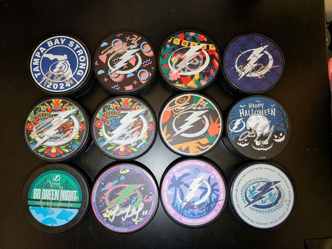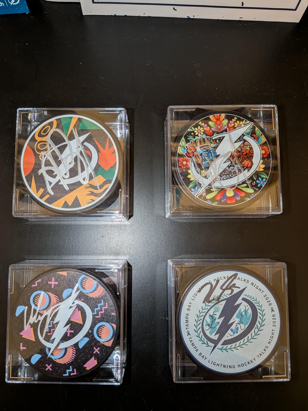 Tous sont à échanger ! J’aimerais vraiment avoir des modèles que je n’ai pas déjà. Les rondelles Kuch/Vasy/Guentz que j’aimerais vraiment échanger contre des designs différents mais garder le même joueur. Je serai également au match mercredi si quelqu’un veut me rencontrer !