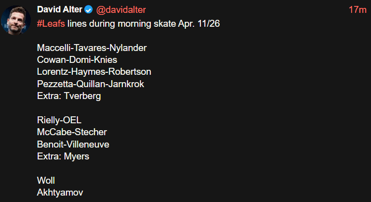 Svalbard38 2 semaines ago Maccelli-Tavares-Nylander Cowan-Domi-Knies Lorentz-Haymes-Robertson Pezzetta-Quillan-Jarnkrok Extra: Tverberg Rielly-OEL McCabe-Stecher Benoit-Villeneuve Extra: Myers Woll Akhtyamov