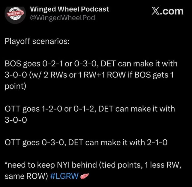 Not that it makes the scenario more likely but Detroit would already have the extra ROW against Boston with one single regulation win and two shootout wins. You can count the RW in both categories.