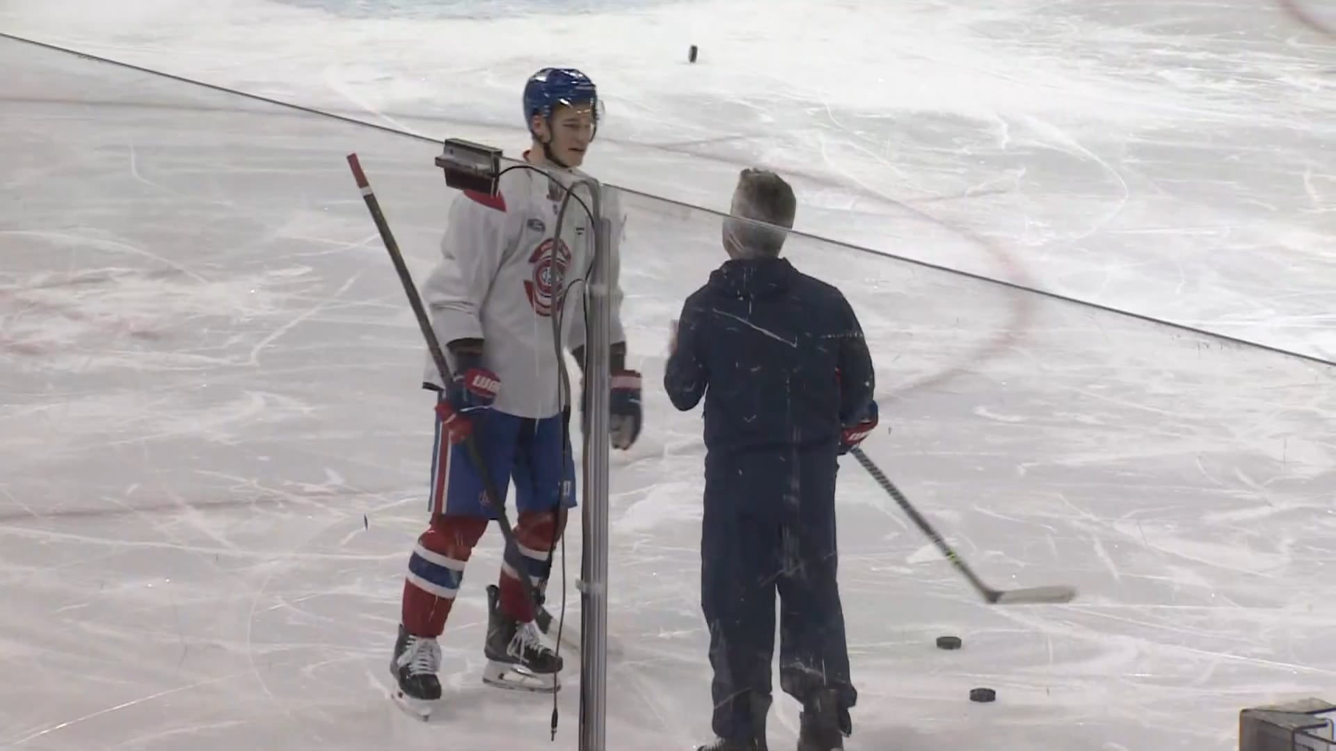 Then he brings him to the blueline, goes back to his left side. Maybe he’s acting out Hutson’s part with the little head-fake and shows him the puck going down along the wall and points in the opposite corner where it should end up. Then he taps the ice and point at the opposite circle as if to show him what the passing lane would be from Hutson’s PoV.