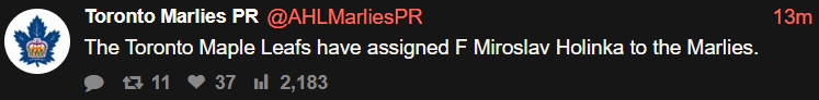 [Marlies PR] Les Maple Leafs de Toronto ont assigné le F Miroslav Holinka aux Marlies