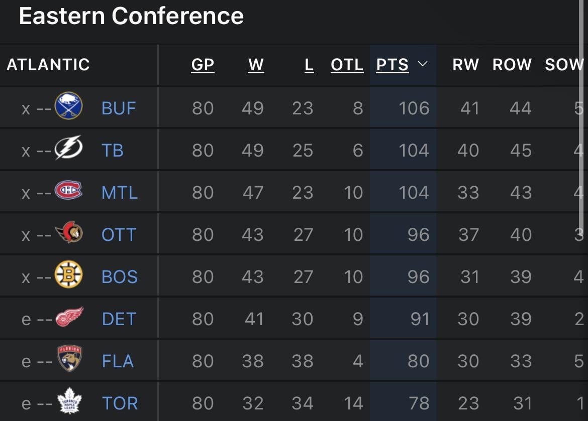 L’Atlantique est terminé — DisasterSuper7309 Ligue nationale de hockeyLNHNational Hockey LeagueNHL 17 Comments MKWIZ49 2 semaines ago Meanwhile in the Metro, half the division is gunning for the one remaining playoff spot Alcebiad3s 2 semaines ago The entire division could end at 0.500 or higher Pratius 2 semaines ago What a weird season this has been Electrical_Long5850 2 semaines ago The Detroit grand griffins black wall brown eye!!💩 ScareCrow13- 2 semaines ago Leafs last 🤗 jopcylinder 2 semaines ago As we all predicted mystery_hobo 2 semaines ago What was it last year? Nearly the exact opposite? The_Cozy_Burrito 2 semaines ago Florida missing is unexpected Jokkers_AceS 2 semaines ago Poor Detroit fans 😂 shadesof3 2 semaines ago Oilers clinching with 90 points! Spacetraveler85 2 semaines ago We can beat them all in Final …. Go STARS GO ! mcgrupp44 2 semaines ago I’m straight up not having a good time MrRemoto 2 semaines ago The #1 team in the Pacific would be in 6th. cdcformatc 2 semaines ago that one guy that took the $10 bet with long odds of buffalo winning the division is about to be a millionaire Ok_Addendum_7633 2 semaines ago When was the last time leafs and panthers were both out of playoffs gorram1mhumped 2 semaines ago Boston out? joeyg151785 2 semaines ago Buffalo is glad to be apart of the madness. It’s been so long, but we will enjoy every moment, even if it doesnt last long. Also, wtf pacific? That division is terrible.. Write A CommentVous devez vous connecter pour publier un commentaire.