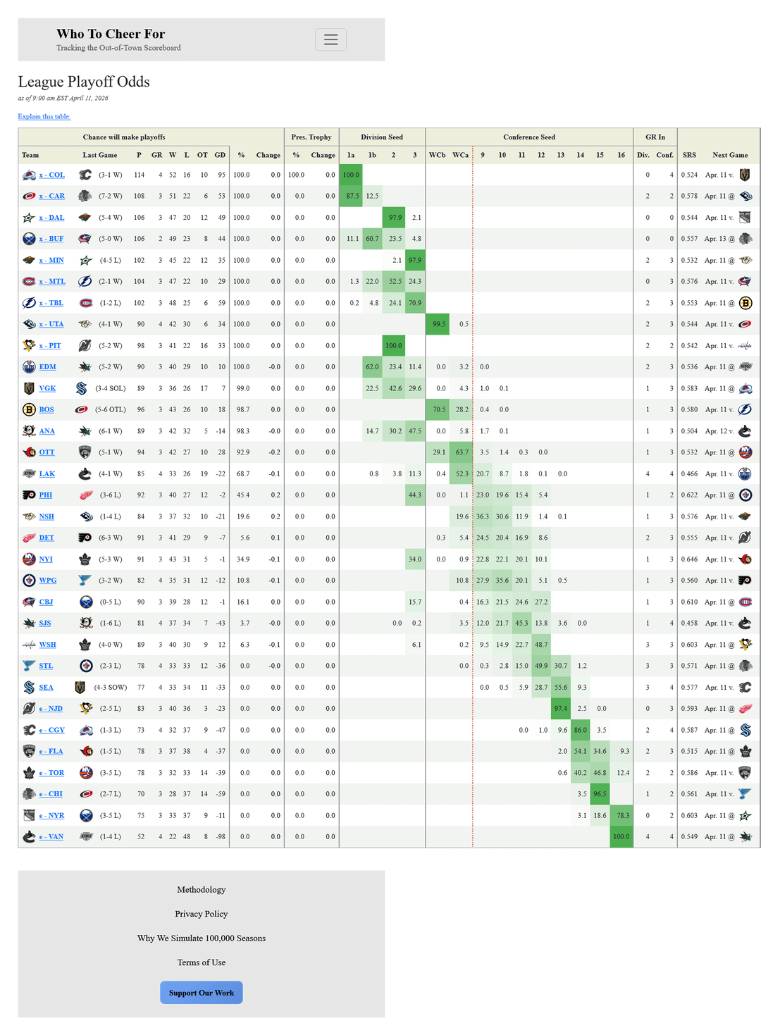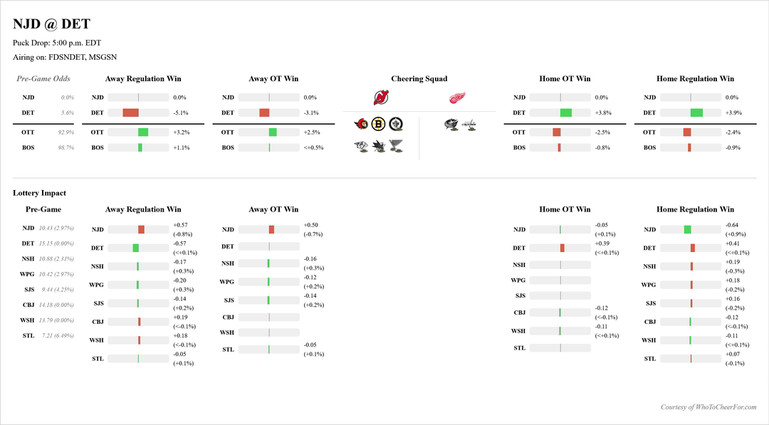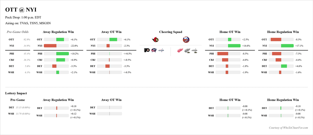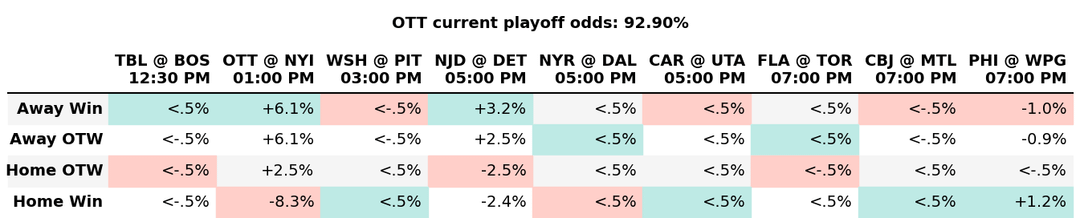 So if Ottawa wins and Detroit loses, Ottawa has a 102.2% chance of making the playoffs. I like those odds