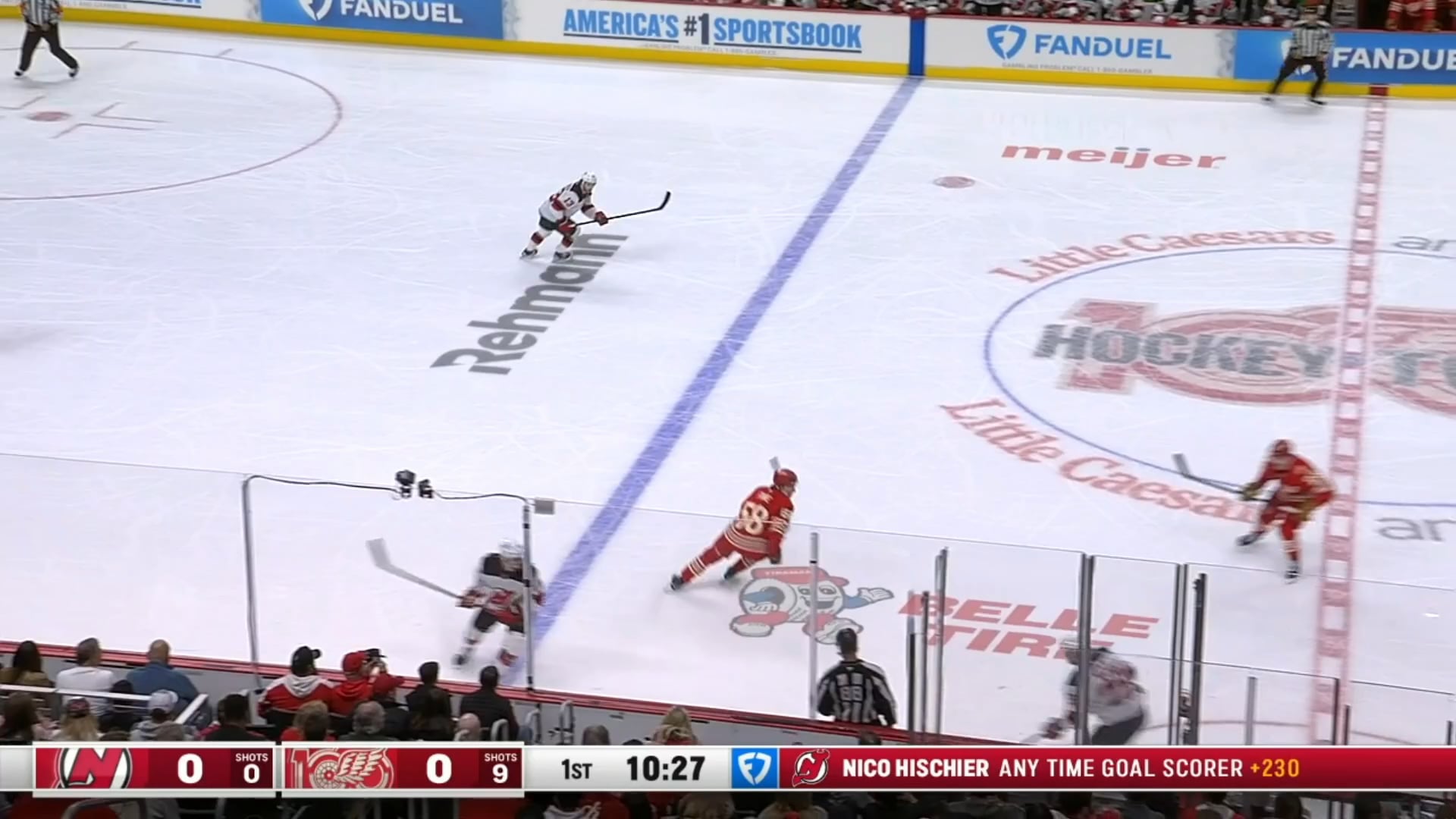 [DET (1) – NJD 0] Larkin fait jaillir Faulk qui passe devant Allen pour ouvrir le score et une pieuvre frappe la glace. Les shorts sont 10-0 dans le premier.
