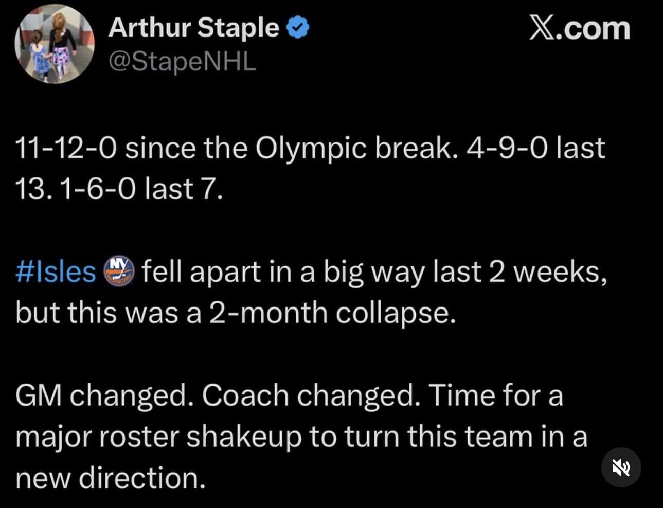 Even when the vibes were good coming out of the olympic break the isles had to come back from down 2 goals for a lot of those wins and the instant the luck dried up (Schaefer not being able to make magic happen) they fell apart.
