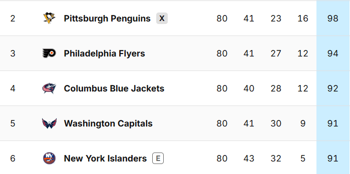 It is very strange that we are this late in the season and the Penguins are the only team in the East that is locked into a particular playoff spot. We have been guaranteed Metro-2 and hosting Metro-3 since Thursday.