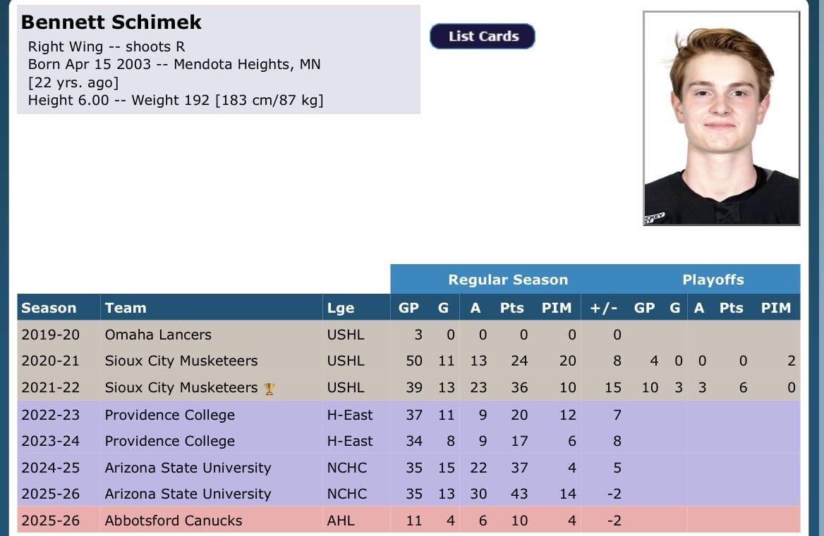 Schimek a discrètement été un bon agent libre de la NCAA en signant pour les Canucks. Devrait obtenir un contrat avec la LNH cet été