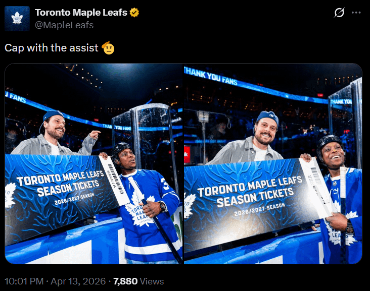 « Cap with the assist 🫡 » Matthews fait une apparition surprise au 2e entracte pour récompenser un fan avec des abonnements pour la saison 26/27