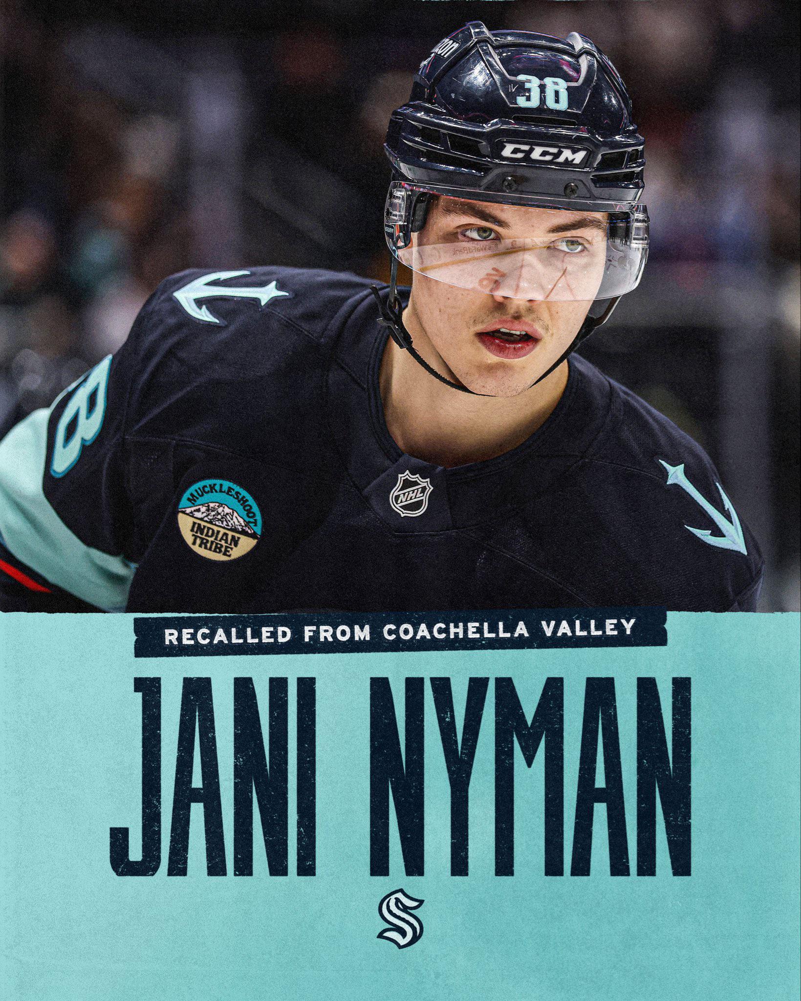 Selon Seattle Kraken PR : « Le #SeaKraken a rappelé Jani Nyman des @Firebirds de Coachella Valley. De plus, l’équipe a réaffecté Jacob Melanson et Oscar Fisker Mølgaard à Coachella Valley. »
