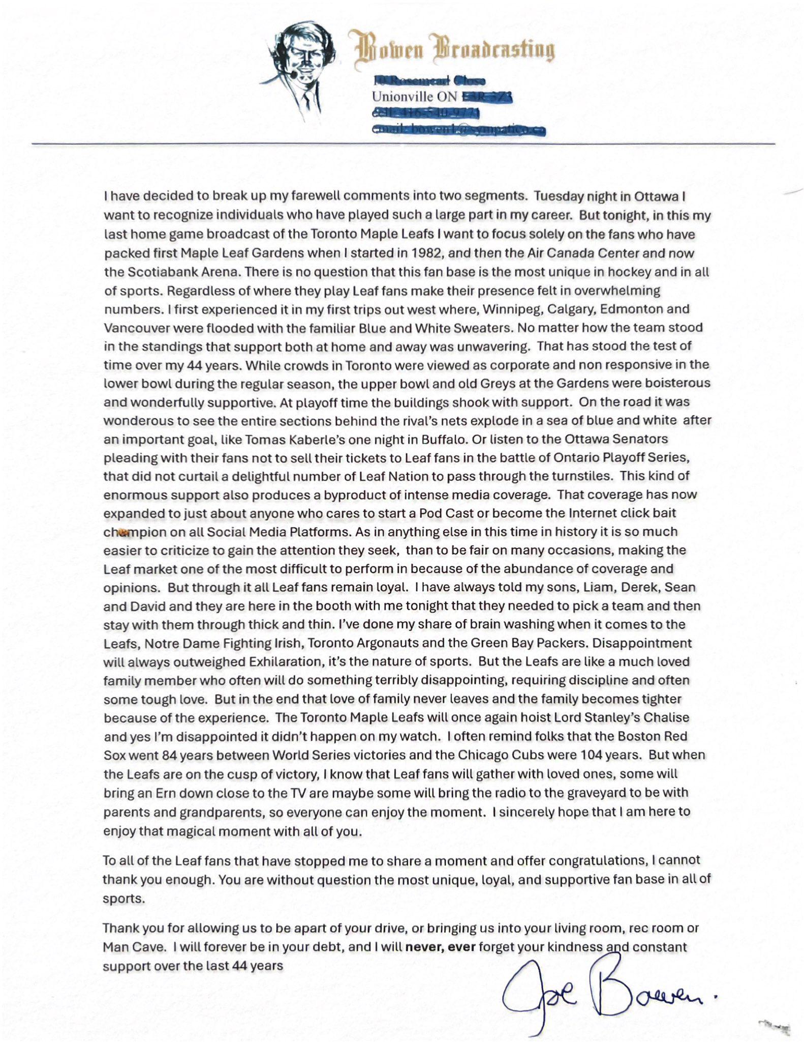 [Joe Bowen] Ils chantent le classique de Gerry et Pacemakers, You’ll Never Walk Alone, avant chaque match de football de Liverpool. C’est ce que je ressens pour les fans de hockey des Maple Leafs de Toronto. J’ai essayé de le mettre en mots hier soir lors de mon dernier match à domicile. Une copie de ces réflexions est jointe. Merci beaucoup.