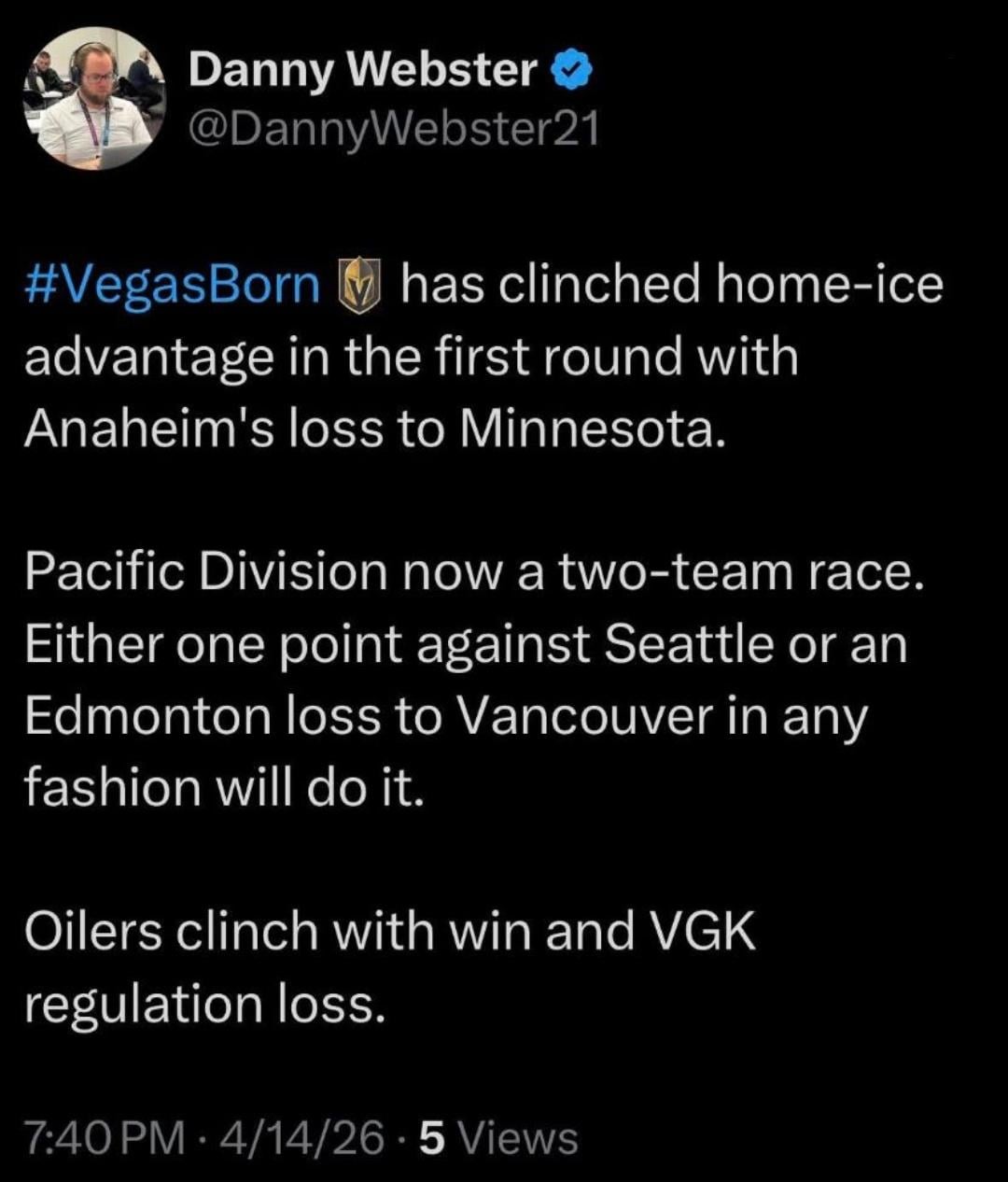 Glace à domicile au premier tour ! — projekt_6 Association de l’OuestGolden Knights de VegasPacific DivisionPacifique DivisionVegas Golden KnightsWestern Conference 7 Comments Phrenicos466 4 jours ago Nice. Be great if our Game 1 was on Sunday. But I *really* hope things work out so that Edmonton and LA play each other for the sixth year in a row. That would be hilarious. fellowENT18 4 jours ago This also means Edmonton is no longer a possible 1st round opponent which was definitely the worst option AntarcticIceCap 4 jours ago I hope we play Anaheim first round but I don’t think that’s very likely. teatew 4 jours ago I mean, I kind of want to play the ducks in the first round. They’re not very good right now… So I guess that means, Go Kings? SRSgoblin 4 jours ago Freaking silly to be in this position as bad as we’ve been for long stretches this year. The Pacific is truly one of the divisions of all time. dal5dal5 4 jours ago Thanks quackers 🦆💛🩶🙏🏻 ItinerantDrifter 4 jours ago Working through it logically, if we win the division we are now guaranteed to play UTA in the first round… because of the following: It’s not possible for ANA to pass UTA bc of the tiebreaker, so they cannot be WC1. And if EDM/LAK pass UTA, they’d also necessarily have to pass ANA… so they wouldn’t be either WC in those scenarios. Write A CommentVous devez vous connecter pour publier un commentaire.