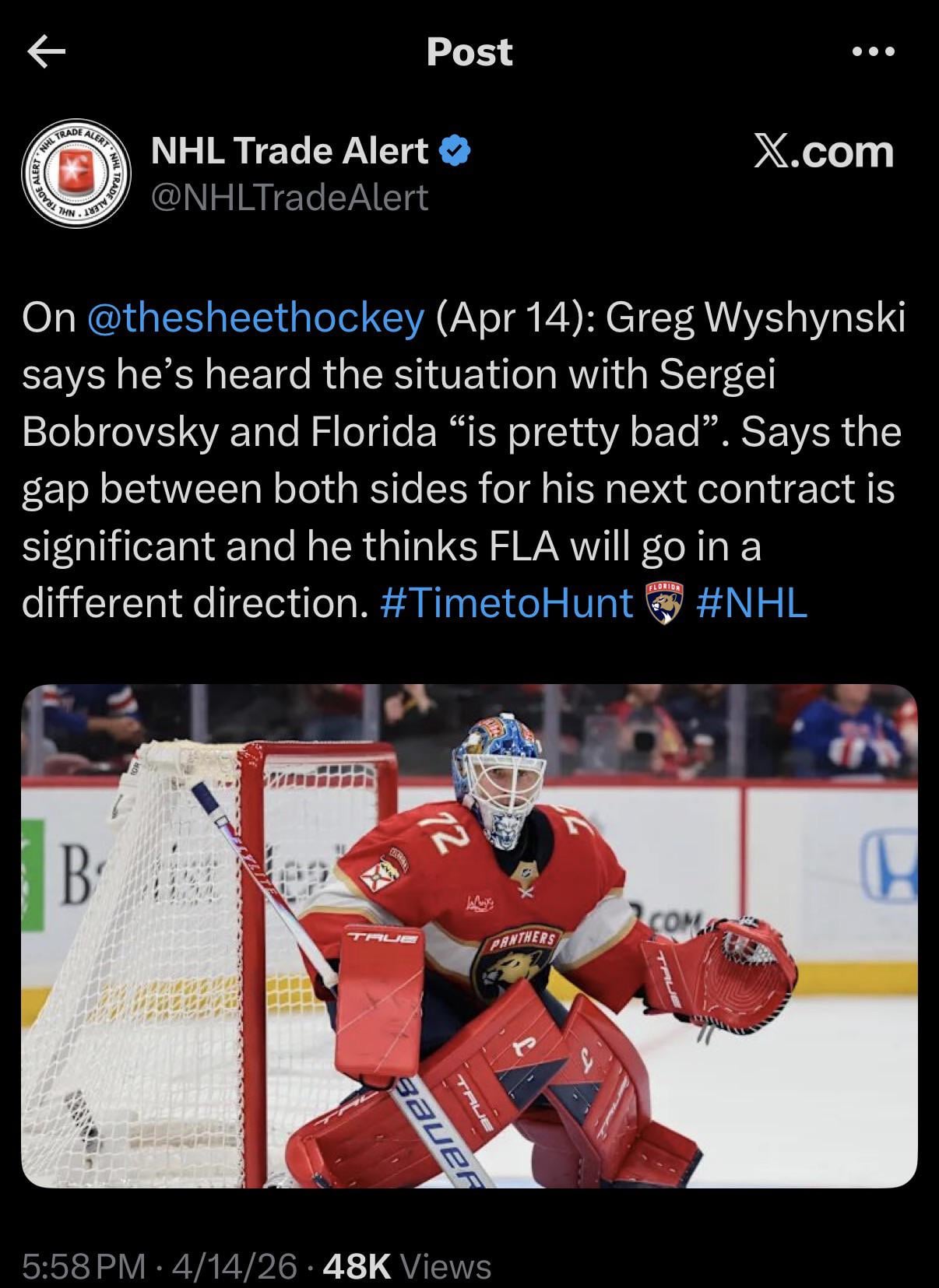 [NHL Trade alert] Sur le hockey (14 avril) : Greg Wyshynski dit qu’il a entendu dire que la situation avec Sergei Bobrovsky et Florida « est plutôt mauvaise ». Il dit que l’écart entre les deux parties pour son prochain contrat est important et il pense que la FLA ira dans une direction différente.