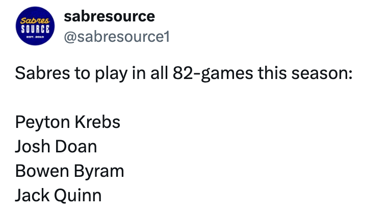 Quatre Sabres en lice pour les 82 matchs de saison régulière : Krebs, Doan, Byram, Quinn — Bri_The_Nautilus Association de l’EstAtlantic DivisionAtlantique DivisionBuffalo SabresEastern ConferenceSabres de Buffalo 4 Comments modernday_mussolini 3 jours ago What’s the updates on Carrick and Lyon? depressivehacks 3 jours ago My dream is for Norris to make this list one day. Poughy 3 jours ago Quinn is a shocker. Good for him drc3686 3 jours ago A hell yeah to all four. And a special hell yeah to Jack Quinn for erasing doubters and making this team a wagon. Write A CommentVous devez vous connecter pour publier un commentaire.