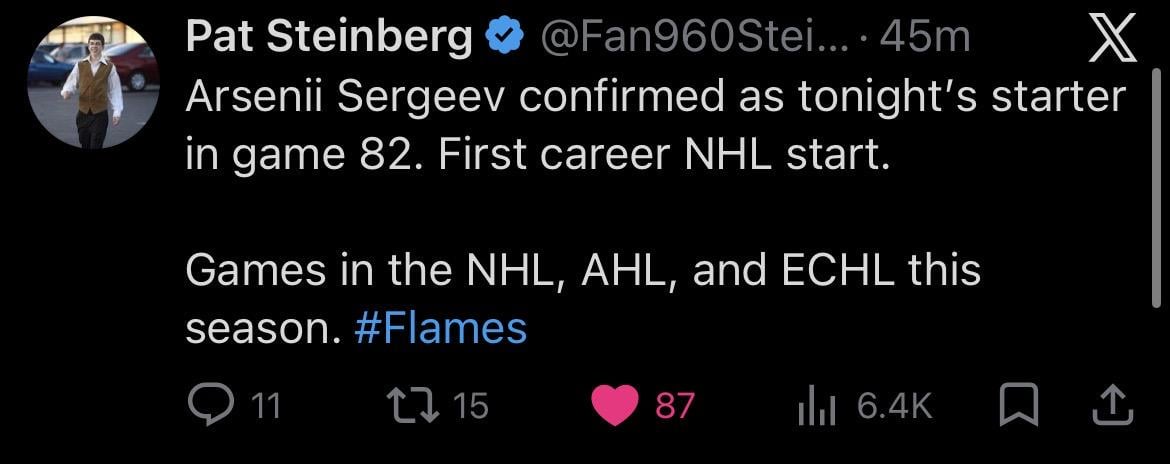 Arseni Sergeev confirmé comme titulaire ce soir contre LAK – Par Pat Steinberg — Republic-Of-OK Association de l’OuestCalgary FlamesFlames de CalgaryPacific DivisionPacifique DivisionWestern Conference 12 Comments ErikDebogande 5 heures ago STAY CALM ITS HAPPENING imaybeacatIRl 5 heures ago Oh hell yes Republic-Of-OK 5 heures ago Hoping for a loss, but also that Arseni has a good game. Secret-Asian 5 heures ago I’m worried he might stand on his head,but that might be a good thing. Still want the L tho…. lock in third from the bottom weschester 5 heures ago Man I love Conroy so much!! He knows exactly what tonight means to this franchise. Confused_Astronaut 4 heures ago Holy crap could one of our goalies actually HELP with the tank for once? Let’s hope so! I’m sorry Arseni. Nothing personal. Hope you have a fantastic career…after today. sociallyrestarted 4 heures ago YES!!!!! Thank you conroy/huska. Hoping the best for Sergeev of course. But please be an L Chronixx 4 heures ago Dude I want the best for this kid but I hope the Kings pump him just for tonight I wasn’t on board with team tank but we’re so close to a bottom 3 finish that it has to happen now PaleSurprise2770 4 heures ago SERGEEEEEEEEEEEEEEEEEEEEEEEEEEEEEEEE!! CorrectorThanU 4 heures ago Been watching him since last Frozen four, kid looks like hes got all the tools to make it. God i love our goalie department. LordHeph625 4 heures ago Conroy is a fucking beauty Evening_Cheesecake25 3 heures ago I’m glad Cooley got « sick ». Write A CommentVous devez vous connecter pour publier un commentaire.