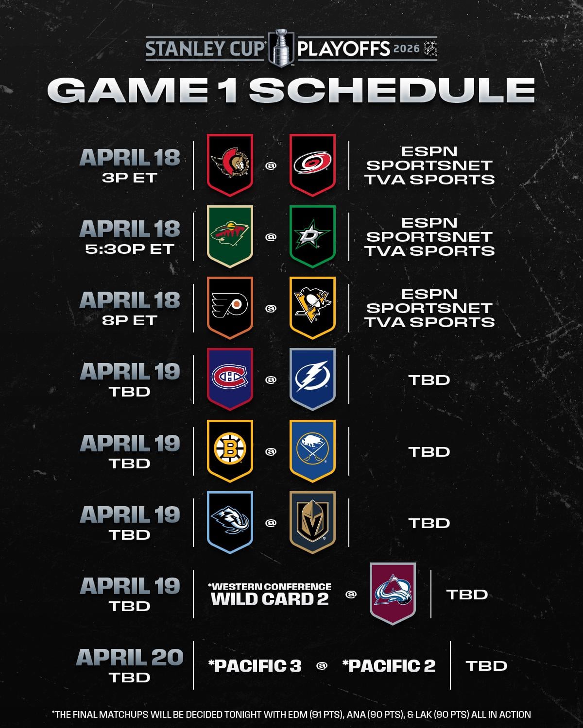 Calendrier du premier match du premier tour des séries éliminatoires de la Coupe Stanley