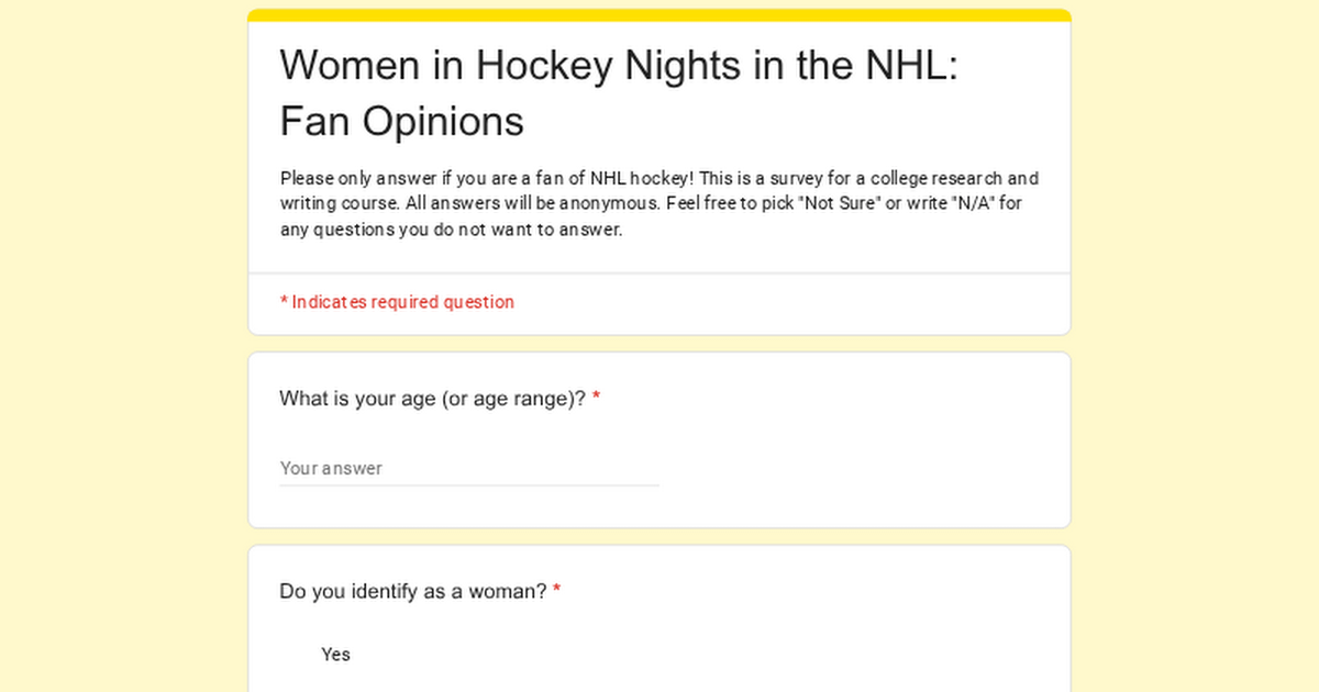 Bonjour, j’écris un essai sur les soirées à thème dans la LNH pour un cours universitaire, et il serait très utile que certains fans du Kraken puissent remplir les formulaires Google sur les soirées des femmes dans le hockey, les soirées de la fierté et les soirées du patrimoine/culture ! Je cherche à connaître les points de vue et les opinions des fans, qu’elles soient positives, négatives ou neutres.