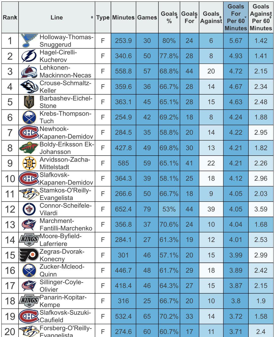 [MoneyPuck] Meilleures lignes d’attaquants de la saison régulière de la LNH selon les buts marqués par 60. (Minimum 250 minutes jouées ensemble 5 contre 5).
