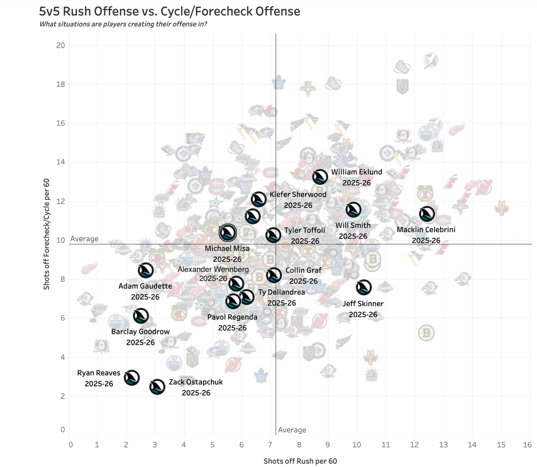 - Rush contre échec-avant/infraction de cycle : La plupart des buts dans la LNH sont marqués sur le coup. WillMack a tous deux tendance à générer des tirs à partir de la course, tandis qu’Eklund est le leader de l’équipe dans la génération de tirs à partir de l’échec-avant/du cycle. Celebrini se rapproche du sommet de la LNH en termes de génération de tirs dès la course. Tous les trois sont dans le quadrant supérieur droit, ils font donc élite dans les deux cas. Les 3 meilleurs joueurs de la LNH pour les deux paramètres sont Eichel, MacKinnon et Kucherov, qui, comme vous pouvez le voir, forment leur propre petit groupe.