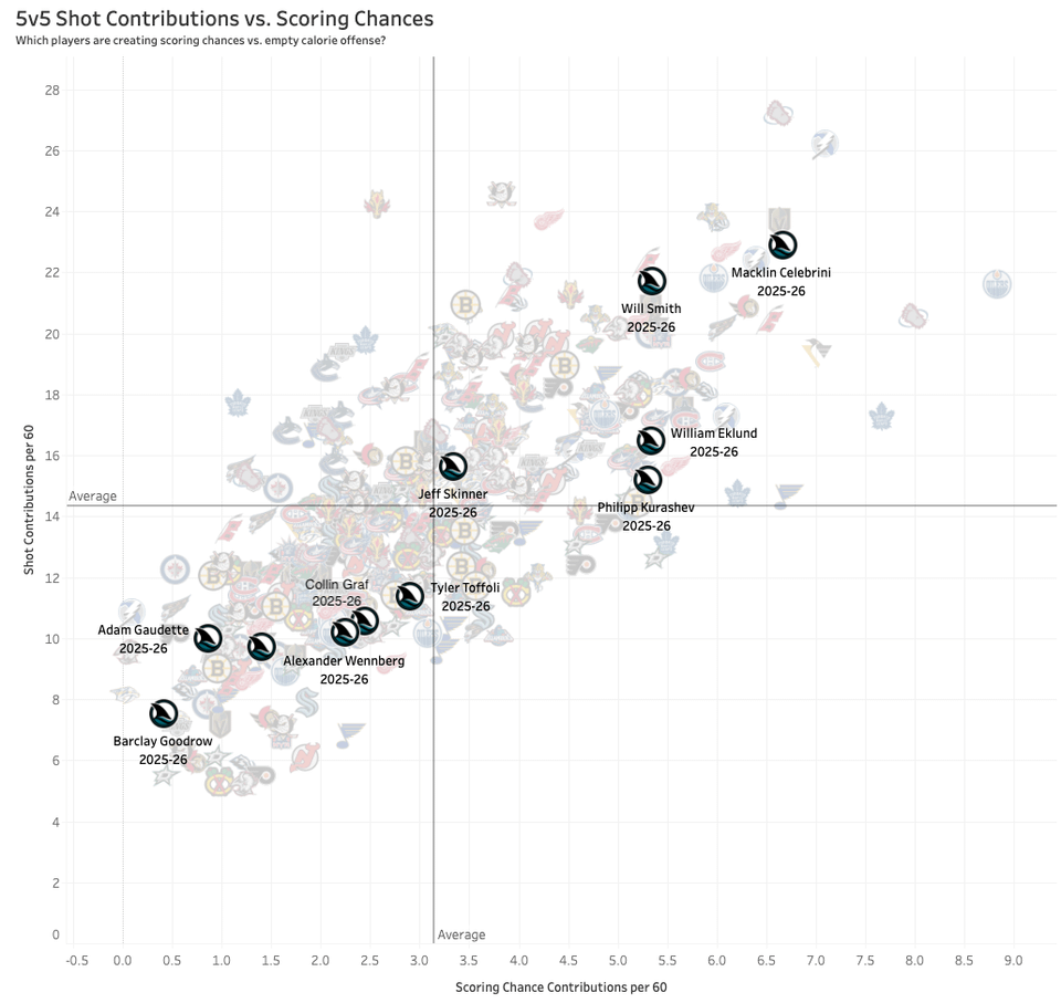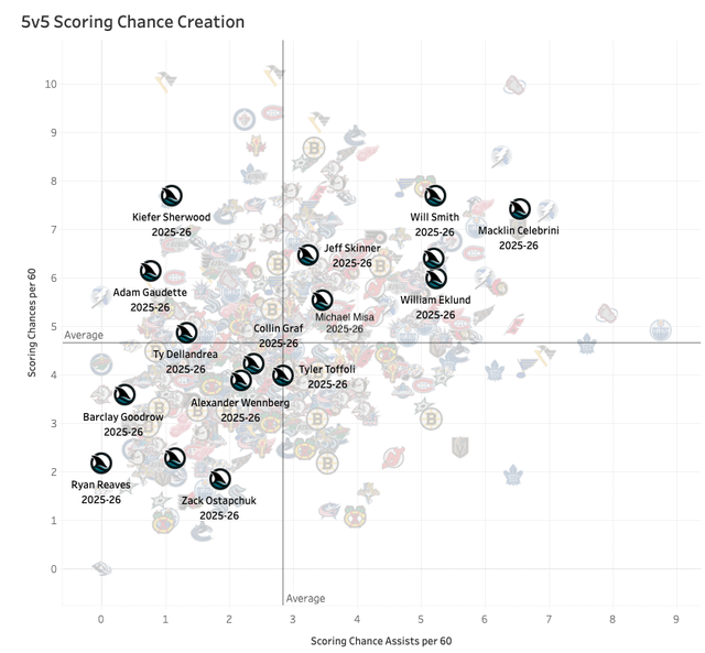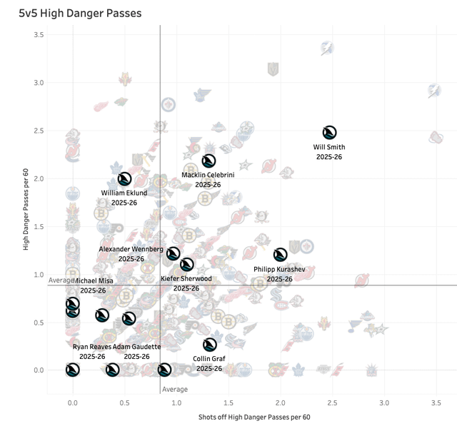 So that passing stat for Smith is certainly influenced by Celebrini because of how much he passes to Celebrini and vice versa. Celebrini gets open in dangerous areas and gets shots off. Celebrini also hits him with passes in high danger areas often, while drawing defensive attention so Smith can get his shots off.