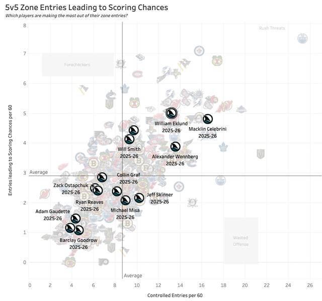 - Entrées de zone menant à des chances de marquer (attaque précipitée) : Celebrini, Eklund et Wenny sont des élites pour transporter la rondelle à travers la ligne bleue adverse. Eklund et Celebrini transforment ces entrées en danger le plus souvent et sont parmi les meilleurs pilotes de jeu de la LNH. Wenny ne transforme pas lui-même les entrées en occasions de marquer – il est un solide moteur de jeu. Smith atteint à peine le quadrant supérieur droit mais est toujours bon. Il est à l’opposé de Wennberg – des entrées moins contrôlées, mais il crée plus d’occasions de marquer lorsqu’il transporte la rondelle. Dans le coin le plus éloigné du quadrant supérieur droit se trouve McDavid. Bédard et Kyle Connor sont les plus proches de McDavid, mais toujours loin.