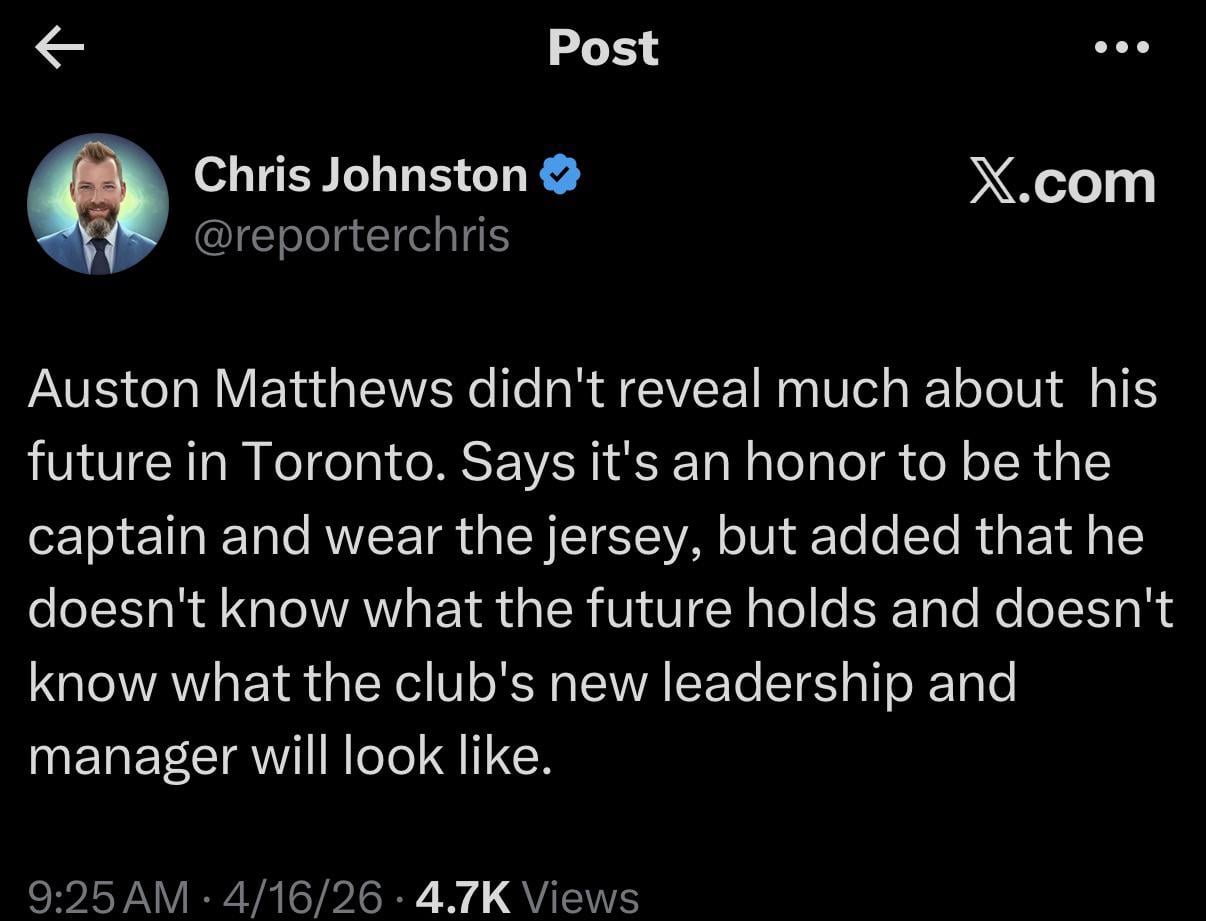Auston Matthews on his place with the Leafs and his future: “I can’t predict the future. There’s obviously steps that are going to have to take place with new leadership management and stuff like that. I don’t really know. I don’t really know. I can’t really predict the future.”