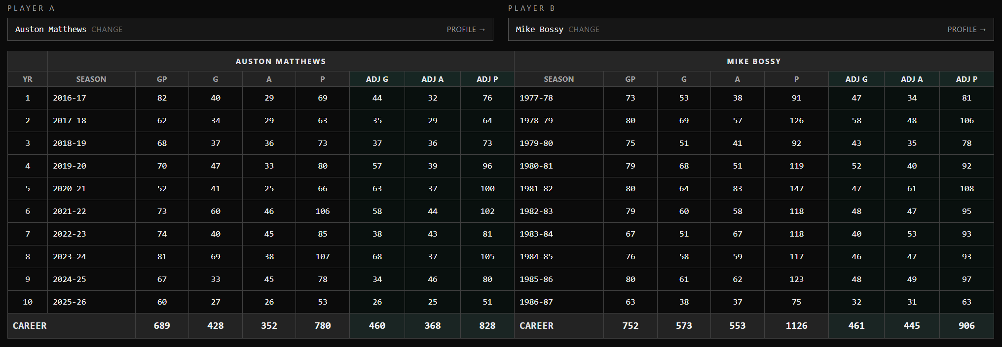 Même si j’en ai un couple "années en baisse"Matthews égale toujours Bossy pour les buts ajustés à l’époque en beaucoup moins de matchs.