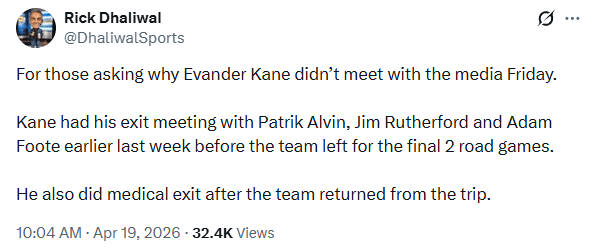 [Dhaliwal] Pour ceux qui demandent pourquoi Evander Kane n’a pas rencontré les médias vendredi. Kane a eu sa réunion de sortie avec Patrik Alvin, Jim Rutherford et Adam Foote plus tôt la semaine dernière avant le départ de l’équipe pour les 2 derniers matchs sur la route. Il a également effectué une sortie médicale après le retour de l’équipe du voyage.