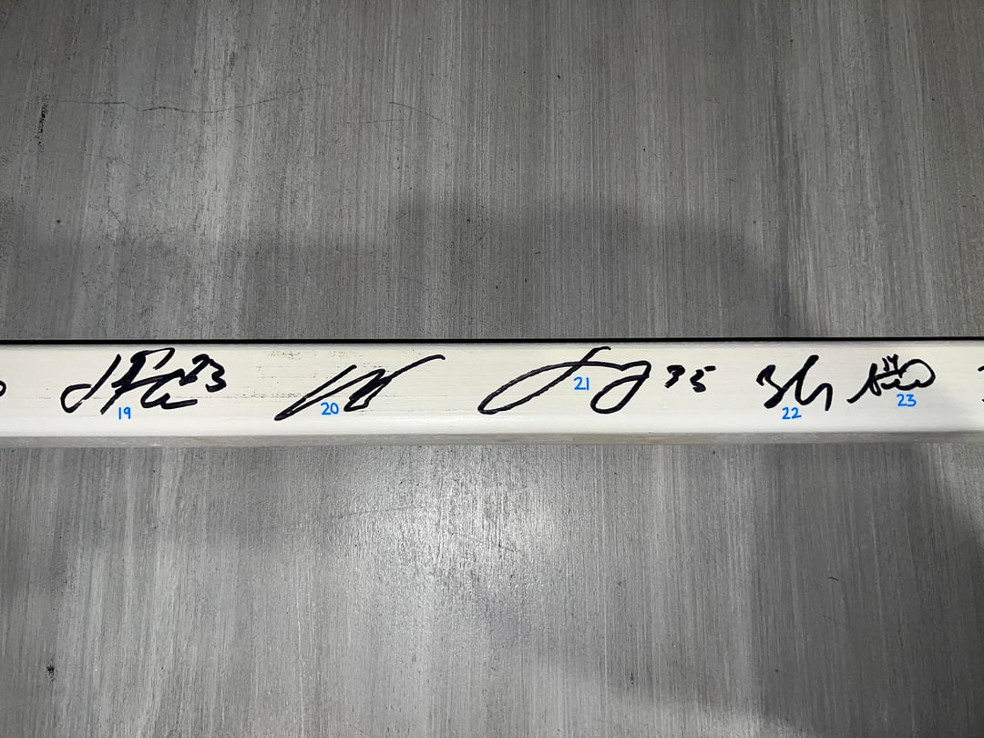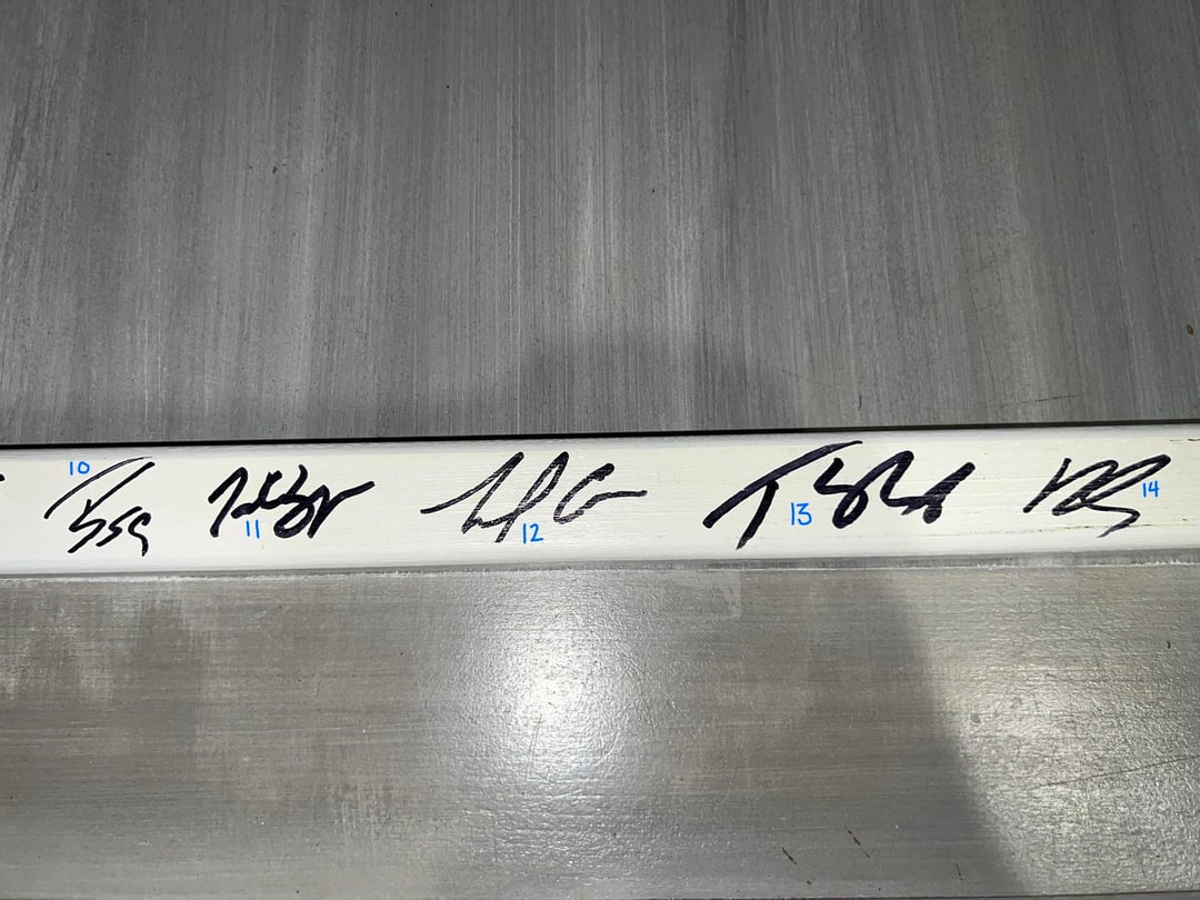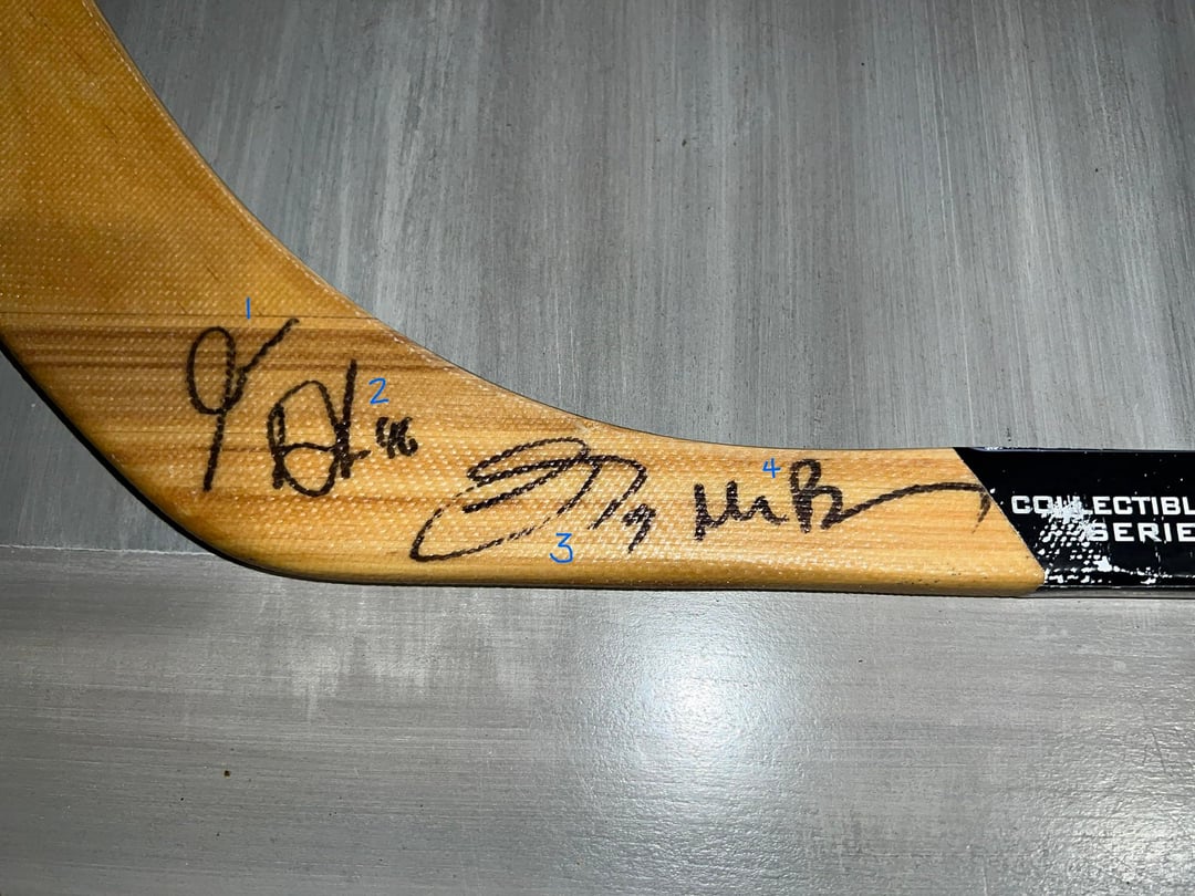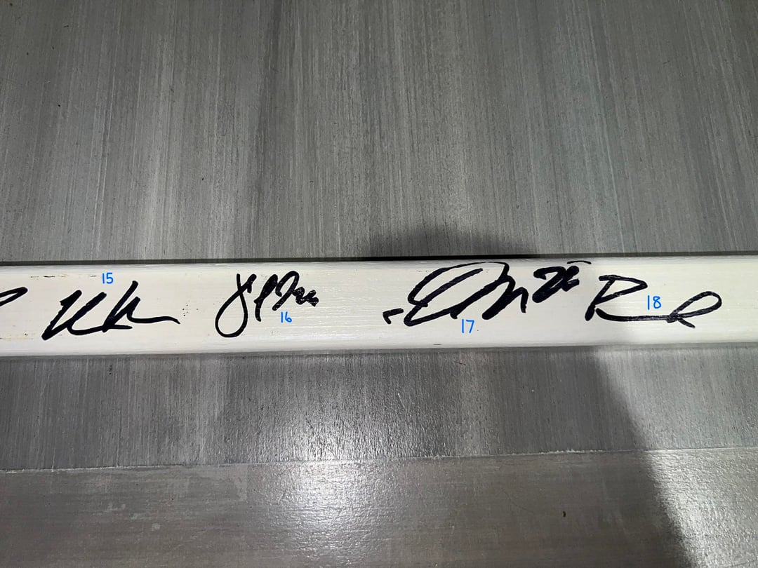 J’ai reçu ce bâton signé de mon père… j’ai pu le limiter à l’équipe 2016-17. J’en ai la plupart confirmés, mais il manque toujours le n°6 (voir photos). Je ne suis pas non plus sûr de quelques autographes (McAvoy, Marchand, Rask, etc). Remarque : certaines de ces signatures sont si mauvaises que c’est plutôt drôle. Merci.